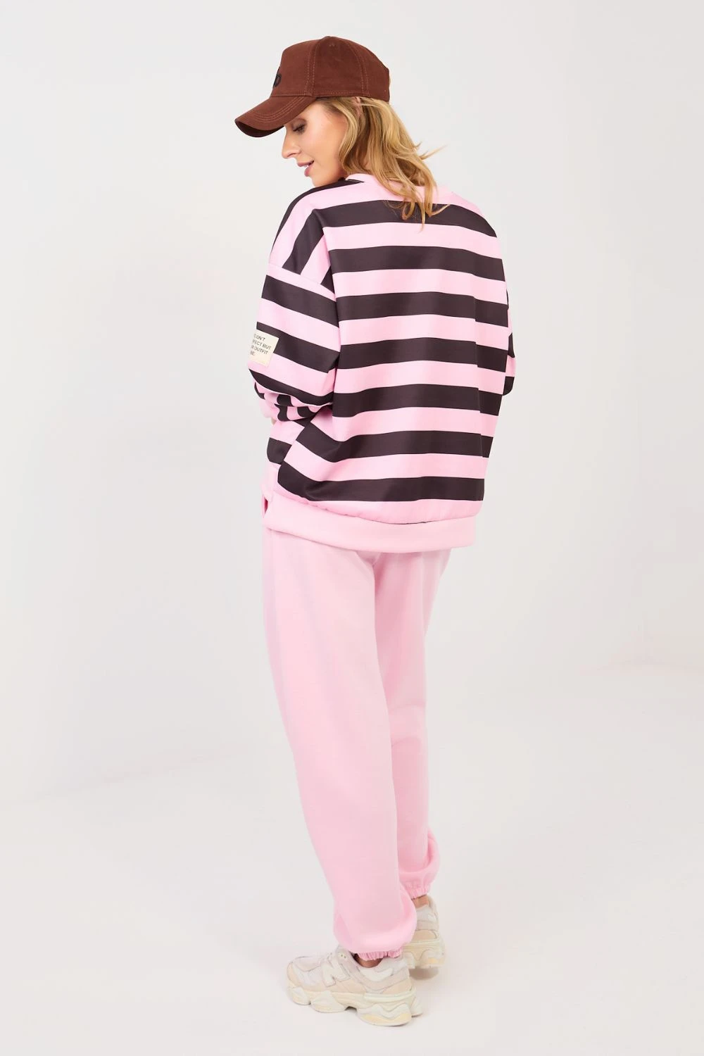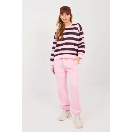 Elegantní set sportovního oblečení v casual stylu je ideální nabídkou pro každý den. Kombinace pohodlí a módních detailů zaručuje, že sada bude skvěle vyhovovat běžným aktivitám, procházkám nebo relaxaci. Mikina s dlouhým rukávem a kulatým výstřihem se vyznačuje pruhy na materiálu, které jí dodávají moderní charakter. Dalším akcentem je decentní nášivka na levém rukávu, zdůrazňující stylový vzhled modelu. Kalhoty s vysokým pasem a dlouhými nohavicemi zakončenými manžetami se perfektně přizpůsobí postavě. V pasu je elastický pásek a šňůrky k uvázání, což umožňuje individuální přizpůsobení. Boční kapsy zvyšují funkčnost setu. Celý kousek je vyrobený z mimořádně měkkého materiálu typu "máslo" směsi viskózy, bavlny a elastanu. Látka je jemná, elastická a neuvěřitelně příjemná na dotek, zajistí maximální pohodlí při nošení po celý den.