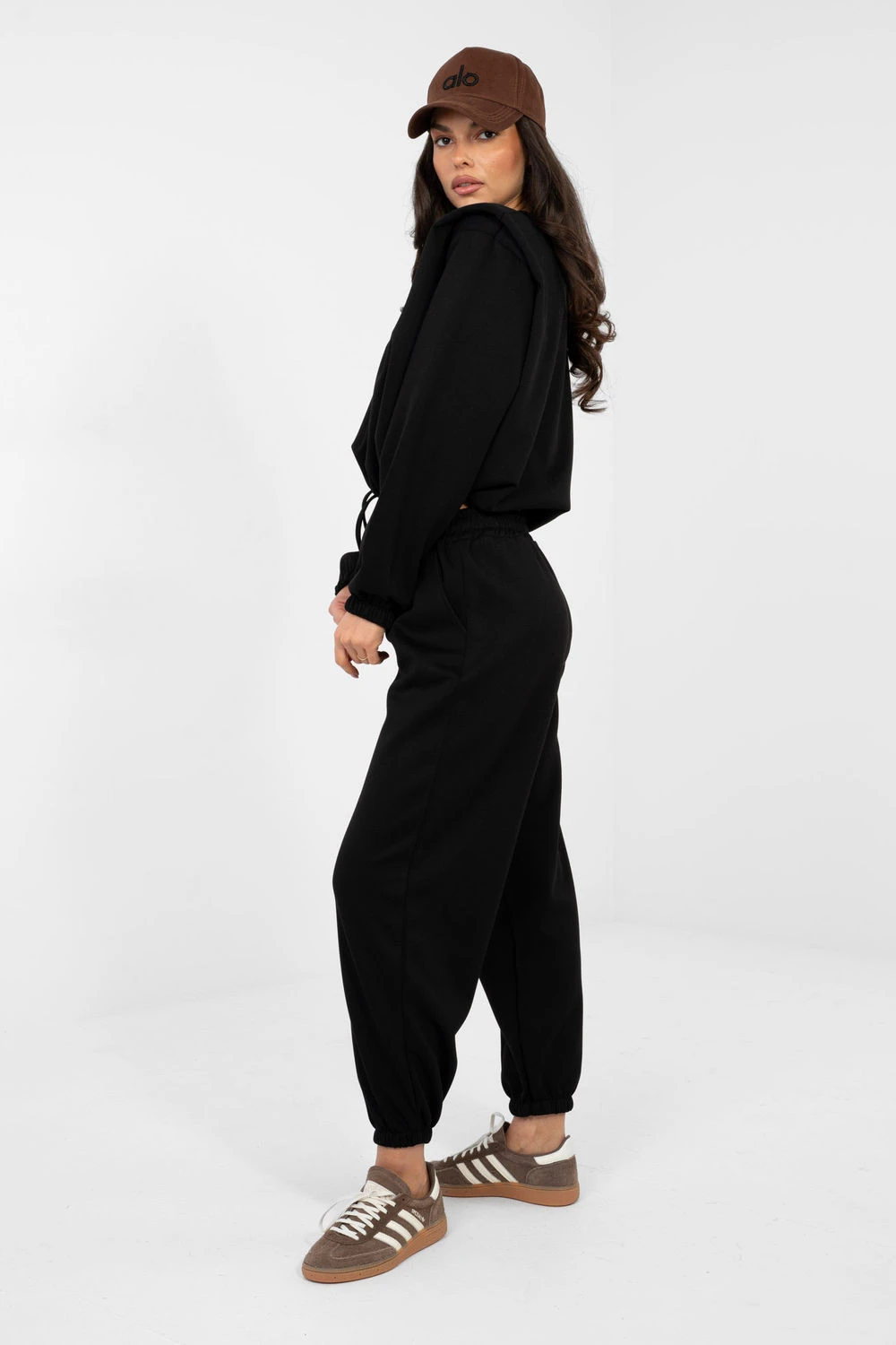 Dámský teplý komplet skládající se z mikiny a kalhot je skvělým návrhem na každý den pro ženy, které oceňují pohodlí a volný, casual styl. Hladký materiál podtrhuje minimalistický charakter setu a činí ho mimořádně univerzálním. Vyrobený z vysoké kvality směsi viskózy a elastanu, ohromuje materiálem typu měkké máslo, jemným a mimořádně příjemným na dotek. Materiál krásně padne na postavě, je elastický a zajišťuje maximální pohodlí při nošení po celý den. Mikina s dlouhým rukávem a klasickým, kulatým výstřihem má šněrování dole, které umožňuje regulaci a jemné zdůraznění pasu. Kalhoty s vysokým pasem a elastickým pásem zaručují ideální přizpůsobení. Dlouhé nohavice zakončené stahovacími manžetami dodávají sportovní charakter a boční kapsy zvyšují funkčnost. Jedná se o ideální volbu pro každodenní nošení, procházky nebo relaxaci v domácím útulku. Stylový, pohodlný a mimořádně příjemný komplet, který se brzy stane oblíbeným kouskem šatníku.