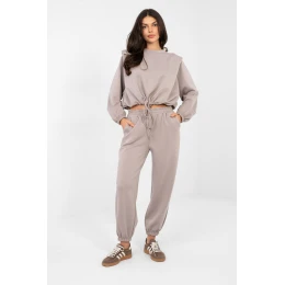 Dámský teplákový set skládající se z mikiny a kalhot je skvělým návrhem na každodenní nošení pro ženy, které ocení pohodlí a uvolněný, ležérní styl. Hladký materiál zdůrazňuje minimalistický charakter setu a činí ho mimořádně univerzálním. Vyrobený z vysoce kvalitní směsi viskózy a elastanu, ohromuje tkaninou typu "máslo" jemnou, hebkou a mimořádně příjemnou na dotek. Materiál krásně padne na postavu, je elastický a zajišťuje maximální pohodlí při nošení po celý den. Mikina s dlouhým rukávem a klasickým, kulatým výstřihem má šňůrku na spodním okraji, která umožňuje regulaci a jemné zdůraznění pasu. Kalhoty s vysokým pasem a elastickým pásem zaručují dokonalé přizpůsobení. Dlouhé nohavice s manžetami na konci dodávají sportovní charakter, a boční vložené kapsy zvyšují funkčnost. Jedná se o ideální volbu na každodenní vycházky, procházky nebo relaxaci v domácím útulku. Stylový, pohodlný a mimořádně příjemný na nošení set, který se brzy stane oblíbeným kouskem šatníku.