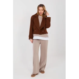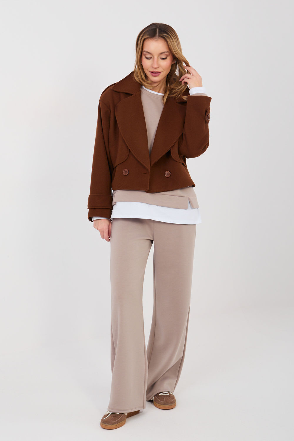 Dvoudílný oblek ve stylu casual je skvělou volbou pro ženy, které ocení pohodlí a moderní minimalismus. Hladký vzor zdůrazňuje univerzální charakter setu, díky čemuž se skvěle hodí jak na každodenní vycházky, tak i pro domácí pohodu. Vyrobený z vysoce kvalitní směsi polyesteru, viskózy a elastanu, set poskytuje pohodlí nošení, elasticitu a příjemné přizpůsobení se postavě. Materiál je měkký, odolný a odolný proti mačkání, což zajišťuje, že set si zachová estetický vzhled po dlouhou dobu. Mikina s dlouhým rukávem je dokončena kontrastními vložkami, které dodávají celku módní charakter. Dalším akcentem je nášivka umístěná vpředu, vlevo dole, zdůrazňující moderní styl setu. Kalhoty s dlouhou délkou a přímými nohavicemi a vysokým pasem krásně tvarují postavu a zajišťují pohodlí nošení. V pase jsou šňůrky k zavázání, umožňující ideální přizpůsobení, a boční kapsy zvyšují funkčnost setu. Jedná se o stylový a praktický set, který kombinuje pohodlí s nadčasovou jednoduchostí.