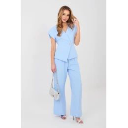 Elegantní dámský set spojující eleganci s moderním střihem. Set se skládá z vesty s krátkým rukávem a dlouhých kalhot s širokými nohavicemi, vytvářející souvislou a efektní stylizaci ideální do práce, na každý den a na společenské události. Vesta s přesýpacím výstřihem krásně zdůrazňuje linii krku a opticky zjemňuje postavu. Model se zapíná na knoflík a v pasu má šňůrku, která umožňuje individuální nastavení a zdůraznění ženských tvarů. Hladký vzor dodává celku nadčasový charakter. Kalhoty s vysokým pasem dokonale modelují postavu, zajistí pohodlí a elegantní vzhled. V pasu je vsazena elastická guma, která zaručuje pohodlné nošení a ideální přizpůsobení. Široké, dlouhé nohavice dodávají stylizaci lehkost a elegance, a praktické boční kapsy zvyšují funkčnost. Set je vyroben z vysoké kvality směsi polyesteru a viskózy, materiál je příjemný na dotek, lehce elastický a dobře padne na postavě. Jedná se o ideální nabídku pro ženy, které ocení eleganci, pohodlí a univerzálnost v jedné stylizaci.