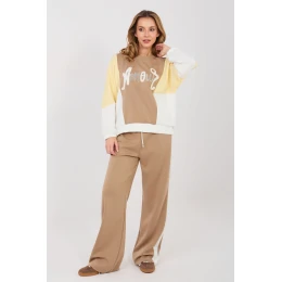 Mimořádně pohodlný dámský teplákový set vyrobený z materiálu typu "máslo", neuvěřitelně měkkého, jemného a příjemného na dotek. Tkanina z kombinace polyesteru, viskózy a elastanu je elastická, lehce padnoucí a skvěle se přizpůsobuje postavě, poskytujíc maximální pohodlí při každodenním nošení. Set se skládá z mikiny s dlouhým rukávem a kalhot s širokými, dlouhými nohavicemi. Mikina s klasickým, kulatým výstřihem je zdobená efektním nápisem s flitry, který celkově dodává módní a ženský charakter. Kalhoty s vysokým pasem krásně zdůrazňují pas a zajišťují pohodlí nošení. V pasu jsou šňůrky na stahování, umožňující dokonalé přizpůsobení postavě. Praktické boční kapsy zvyšují funkčnost a široké nohavice dodávají stylizaci volný, moderní vzhled. Jedná se o ideální set pro ženy, které ocení kombinaci mimořádné měkkosti, pohodlí a módních detailů v každodenních stylizacích.