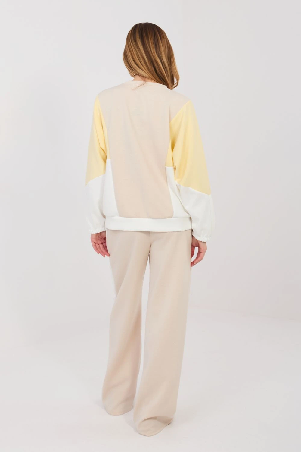Mimořádně pohodlná dámská tepláková sada vyrobena z materiálu typu "flísek" je neuvěřitelně měkká, jemná a příjemná na dotek. Tkanina složená z polyesteru, viskózy a elastanu je elastická, lehce se vlní a skvěle padne na postavu, poskytujíc maximální pohodlí při každodenním nošení. Sada se skládá z mikiny s dlouhým rukávem a kalhot s širokými, dlouhými nohavicemi. Mikina s klasickým, kulatým výstřihem je zdobená efektním nápisem s flitry, který dává celku módní a ženský charakter. Kalhoty s vysokým pasem krásně zdůrazňují pas a zajišťují pohodlné nošení. V pasu jsou šňůrky ke stažení, umožňující ideální přizpůsobení postavě. Praktické boční kapsy zvyšují funkčnost a široké nohavice dodávají outfitu volný, moderní vzhled. Jedná se o ideální sadu pro ženy, které oceňují kombinaci mimořádné měkkosti, pohodlí a módních detailů v každodenních stylizacích.
