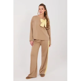 Stylový dámský teplákový set v casual stylu je ideální volbou na každý den. Kombinace pohodlí s módními detaily činí tento set skvělým pro každodenní aktivity, procházky nebo setkání ve volném stylu. Set se skládá z mikiny s dlouhým rukávem a klasickým kulatým výstřihem a dlouhých kalhot s širokými nohavicemi. Hladký vzor zdůrazňuje univerzální charakter setu, díky čemuž je snadné ho sladit s různými doplňky. Mikina je zdobená efektním kontrastním mašlí na přední straně, která dodává celku ženský a decentně elegantní akcent. Kalhoty s vysokým pasem krásně tvarují pas, a elastický pásek v pasu zajišťuje pohodlné přizpůsobení siluetě. Další výhodou jsou praktické boční kapsy a pruhy po stranách nohavic, které dodávají sportovní charakter a opticky prodlužují nohy. Set je vyroben z příjemné směsi polyesteru, viskózy a elastanu, materiál je měkký, elastický a odolný proti vráskám, což zaručuje pohodlí nošení po celý den. Jedná se o pohodlný a ženský set, který kombinuje sportovní volnost s módními detaily.