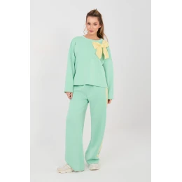 Elegantní dámský dresový set v casualovém provedení je ideální nabídkou na každý den. Kombinace pohodlí s módními detaily zaručuje, že sada se skvěle hodí pro každodenní aktivity, procházky nebo setkání ve volném stylu. Set se skládá z mikiny s dlouhým rukávem a klasickým kulatým výstřihem a dlouhých kalhot s širokými nohavicemi. Hladký vzor zdůrazňuje univerzální charakter setu, díky čemuž je snadné jej sladit s různými doplňky. Mikina je zdobena efektní kontrastní mašlí na přední straně, která dodává celku ženský a decentně elegantní nádech. Kalhoty s vysokým pasem krásně tvarují pas a elastický pásek v pasu zajišťuje pohodlné přizpůsobení siluetě. Další výhodou jsou praktické boční kapsy a pruhy podél nohavic, které dodávají sportovní charakter a opticky prodlužují nohy. Set je vyroben z příjemné směsi polyesteru, viskózy a elastanu, materiál je měkký, elastický a odolný proti mačkání, což zaručuje pohodlí nošení po celý den. Jedná se o pohodlný a ženský set, který kombinuje sportovní volnost s módními detaily.