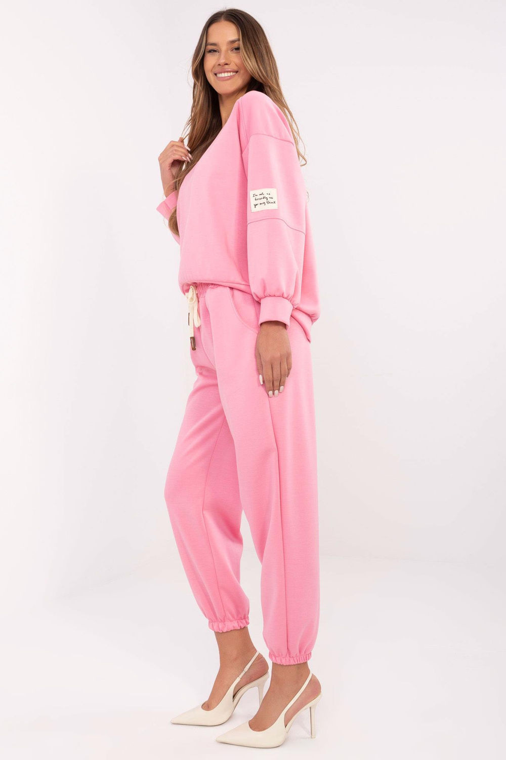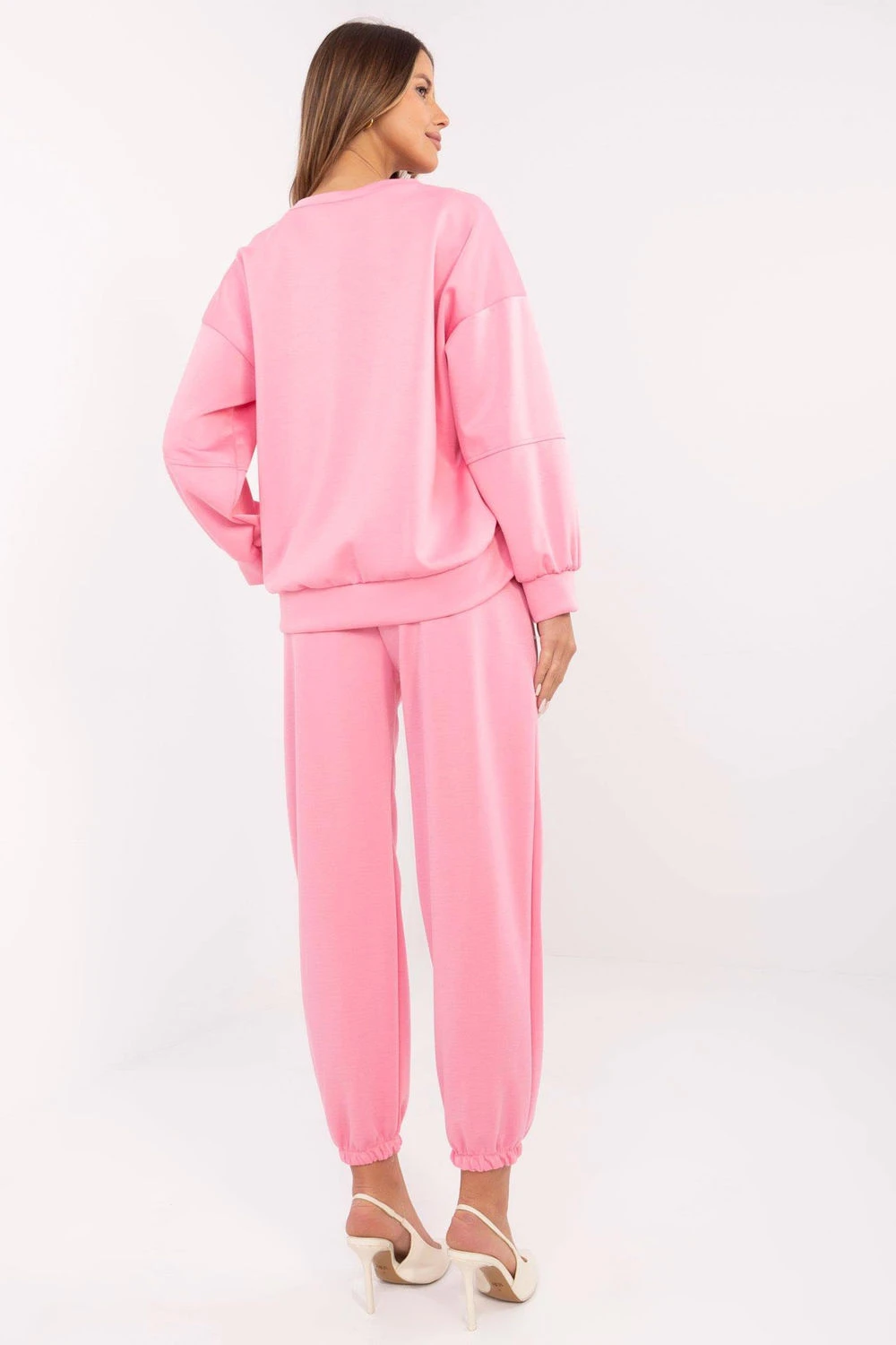 Sada oblečení ve stylu casual je skvělou volbou pro ženy, které ocení pohodlí a módní vzhled ve svém každodenním životě. Vyrobená z vysoce kvalitní směsi viskózy, bavlny a elastanu zajišťuje měkkost, prodyšnost a ideální přizpůsobení se postavě. Mikina s standardní délkou, dlouhými rukávy a kulatým výstřihem zaručuje pohodlí při nošení a její minimalistický, hladký vzor z ní dělá mimořádně univerzální kousek. Kalhoty s vysokým pasem mají boční kapsy a praktické stahování v pase, které umožňuje regulaci obvodu. Dlouhé nohavice zakončené lemy dodávají celkovému vzhledu sportovní charakter. Stylová a pohodlná sada se skvěle hodí do každodenního života, domů, na procházku nebo setkání s přáteli. Lze ji nosit samostatně nebo kombinovat s dalšími kousky oblečení, vytvářející různé casualové outfity.