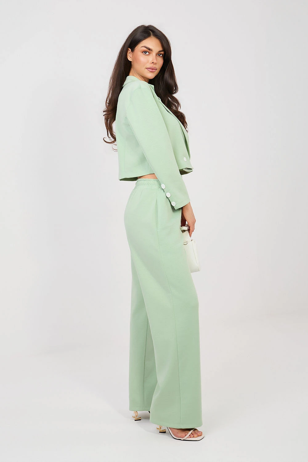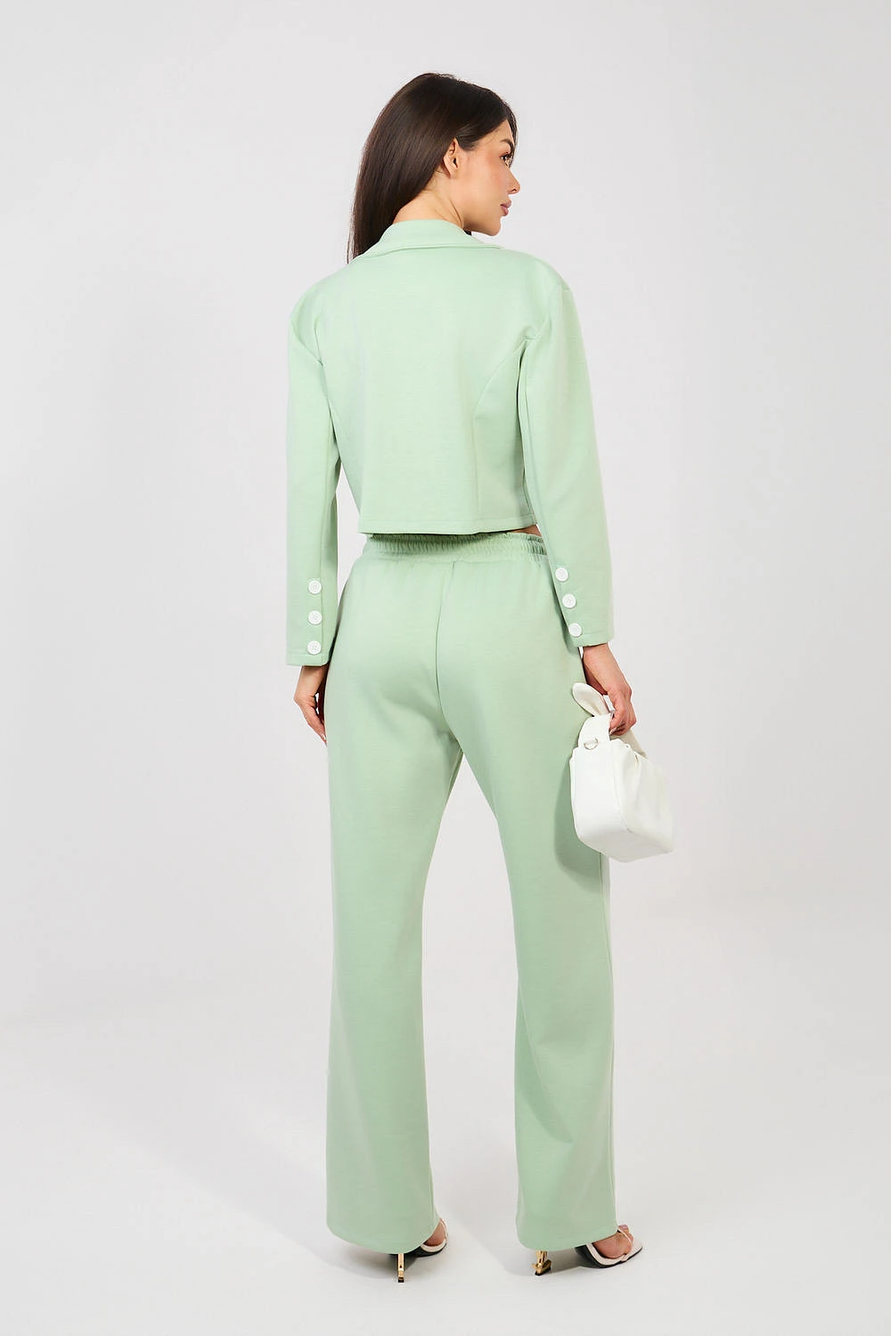 Elegantní dámský komplet skládající se z krátkého saka a dlouhých kalhot je skvělým návrhem do práce i na každý den. Klasický, hladký vzor podtrhuje nadčasový charakter setu a pečlivě vybraná tkanina (polyester, viskóza, elastan) zajišťuje pohodlí, odolnost a estetický vzhled po celý den. Krátké sako s dlouhým rukávem je zdobeno límci, které mu dodávají eleganci a profesionální charakter. Dvojitý řadový zapínací prvek na knoflíky přidává eleganci a jemně tvaruje postavu. Kalhoty s vysokým pasem krásně zdůrazňují pas a zužující se nohavice opticky zjemňují nohy. Model bez klasického zapínání s elastickým pásem na zádech zaručuje pohodlí nošení a ideální přizpůsobení. Další výhodou jsou praktické boční kapsy. Měkký, jemný a velmi příjemný na dotek materiál je univerzálním kompletem, který spojuje eleganci s pohodlím, ideální do kanceláře, na obchodní schůzky a stylové každodenní vycházky.