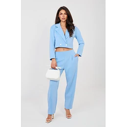 Elegantní dámský set skládající se z krátkého saka a dlouhých kalhot je skvělým návrhem do práce i na každý den. Klasický, hladký vzor zdůrazňuje nadčasový charakter setu a pečlivě vybraná tkanina (polyester, viskóza, elastan) zajistí pohodlí, odolnost a estetický vzhled po celý den. Krátké sako s dlouhým rukávem je zakončeno límečky, které mu dodávají eleganci a profesionální charakter. Dvouradé zapínání na knoflíky přidává eleganci a jemně modeluje siluetu. Kalhoty s vysokým pasem krásně zdůrazňují pas a zúžené nohavice zeštíhlují nohy. Model bez klasického zapínání, s elastickým pásem na zádech, zaručuje pohodlí nošení a ideální přizpůsobení. Další výhodou jsou praktické, boční kapsy. Materiál typu máslo je měkký, jemný a mimořádně příjemný na dotek. Jedná se o univerzální set, který spojuje eleganci s pohodlím, ideální do kanceláře, na obchodní schůzky a stylové každodenní výlety.