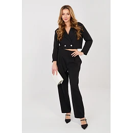 Elegantní dámský komplet skládající se z krátkého saka a dlouhých kalhot je skvělou nabídkou do práce i na každý den. Klasický, hladký vzor zdůrazňuje nadčasový charakter soupravy a pečlivě vybraná tkanina (polyester, viskóza, elastan) zajišťuje pohodlí, trvanlivost a estetický vzhled po celý den. Krátké sako s dlouhým rukávem je zakončeno límečky, které mu dodávají eleganci a profesionální charakter. Dvouřadé zapínání na knoflíky přidává eleganci a jemně tvaruje postavu. Kalhoty s vysokým pasem krásně zdůrazňují pas a zužující se nohavice zjemňují nohy. Model bez klasického zapínání, s elastickou gumou vsazenou do pasu zezadu, zaručuje pohodlí nošení a ideální přizpůsobení. Další výhodou jsou praktické boční kapsy. Měkký, jemný a příjemný materiál, který připomíná máslo, je univerzální komplet, který spojuje eleganci s pohodlím, ideální do kanceláře, na obchodní schůzky a stylové každodenní výstupy.