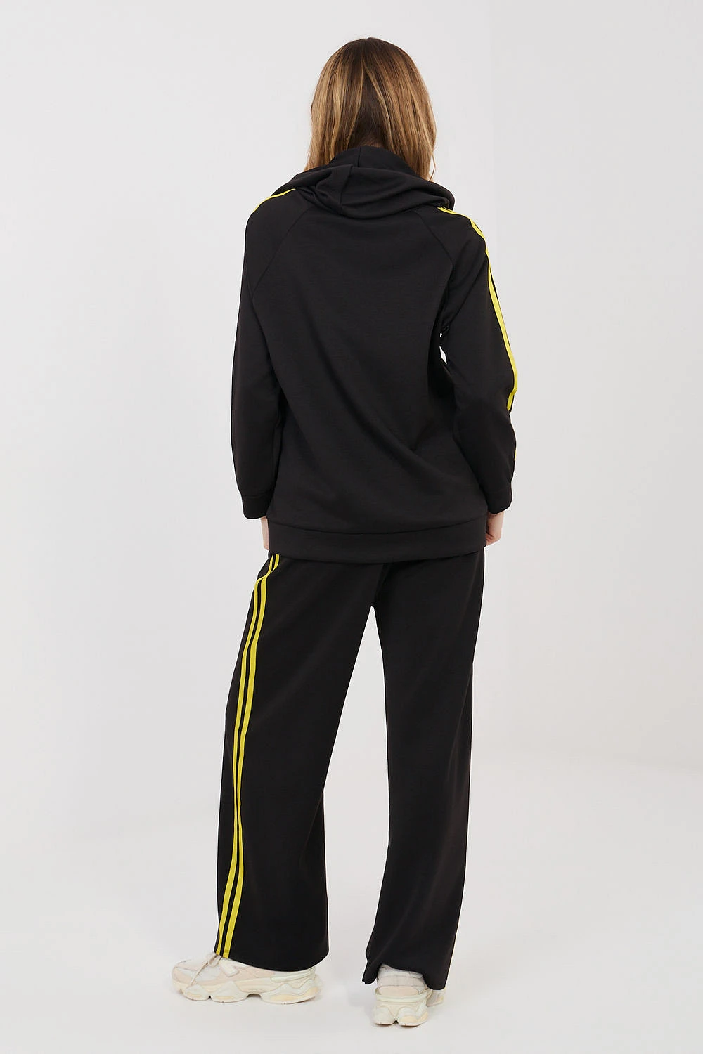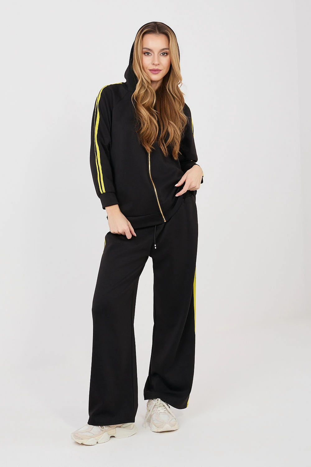Dámský teplý set skládající se z mikiny a kalhot, ideální pro každodenní volnočasový styl. Hladký vzor dělá tento set moderním a univerzálním, takže se skvěle hodí na procházky, nákupy nebo relaxaci. Set je vyroben z pohodlné směsi polyesteru, elastanu a viskózy, která je měkká, elastická a dobře se přizpůsobuje postavě, poskytující komfort po celý den. Mikina s dlouhým rukávem má praktickou kapuci a zip, co usnadňuje oblékání a umožňuje ji přizpůsobit počasí. Další výhodou jsou boční kapsy. Rukávy jsou zdobeny moderními pruhy, které dodávají sportovní charakter. Kalhoty mají vysoký pas a dlouhé, široké nohavice, které poskytují volnost pohybu. V pasu je elastický pásek a šňůrka pro lepší přizpůsobení. Pruhy na nohavicích zdůrazňují moderní, sportovně-volnočasový styl setu.