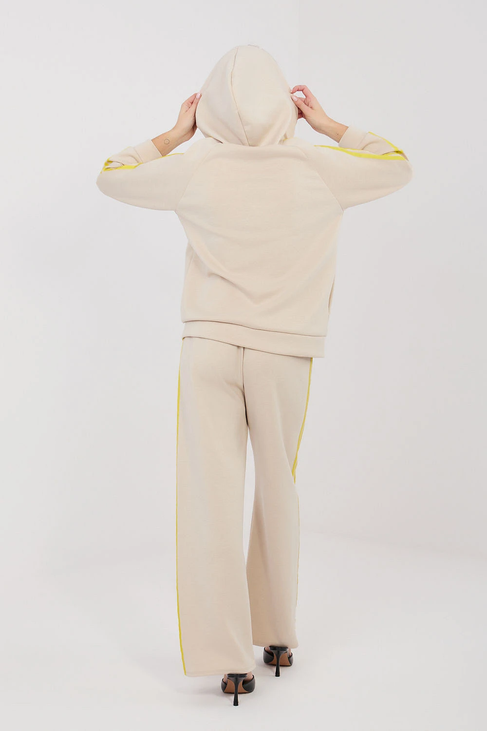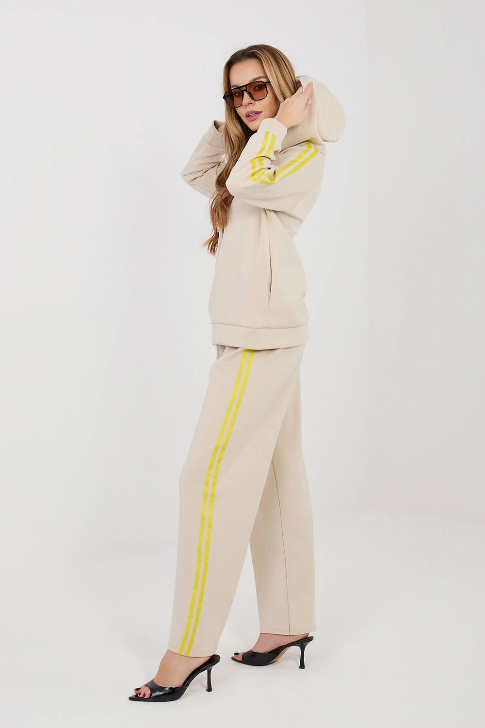 Dámský teplý set skládající se z mikiny a kalhot, ideální pro každodenní outfit v casual stylu. Hladký vzor dává setu moderní a univerzální vzhled, díky čemuž bude skvěle padnout na procházku, nákupy nebo relax. Set je vyroben z pohodlné směsi polyesteru, elastanu a viskózy, materiál je měkký, elastický a dobře se přizpůsobí postavě, poskytující pohodlí po celý den. Mikina s dlouhým rukávem má praktickou kapuci a zip, co usnadňuje oblékání a umožňuje ji přizpůsobit počasí. Další výhodou jsou boční kapsy. Rukávy jsou ozdobeny módními pruhy, které dodávají sportovní charakter. Kalhoty mají vysoký pas a dlouhé, široké nohavice, které zajistí volnost pohybu. V pase je elastický pásek a šňůrka pro lepší přizpůsobení. Pruhy na nohavicích zdůrazňují moderní, sportovně-casualový styl setu.