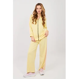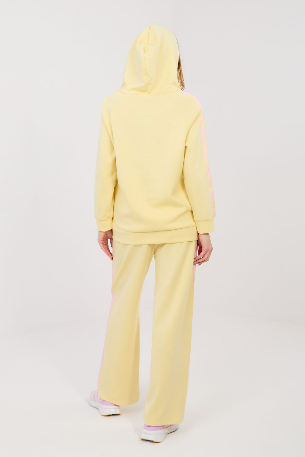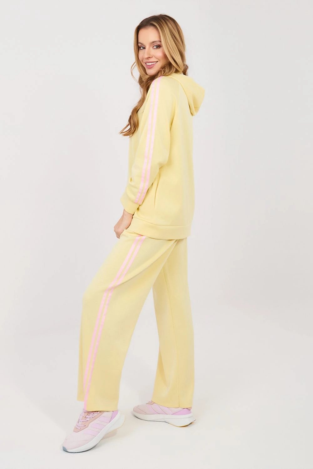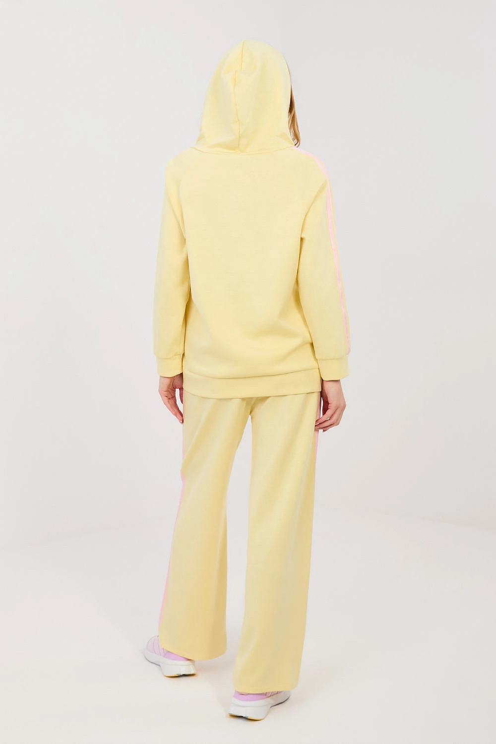 Dámský teplý set skládající se z mikiny a kalhot, ideální pro každodenní outfit v casual stylu. Hladký vzor dělá set moderním a univerzálním, takže se skvěle hodí na procházku, nákupy nebo relaxaci. Set je vyroben z pohodlné a příjemné směsi polyesteru, elastanu a viskózy. Materiál je měkký, elastický a dobře sedí na postavě, poskytující pohodlí po celý den. Mikina s dlouhým rukávem má praktickou kapuci a zip, co usnadňuje oblékání a umožňuje přizpůsobit se počasí. Další výhodou jsou boční kapsy. Rukávy jsou zdobeny módními pruhy, které dodávají sportovní charakter. Kalhoty mají vysoký pas a dlouhé, široké nohavice, které zajistí volnost pohybu. V pase je elastický pásek a šňůrka pro lepší přizpůsobení. Pruhy na nohavicích zdůrazňují moderní, sportovně-casualový styl setu.