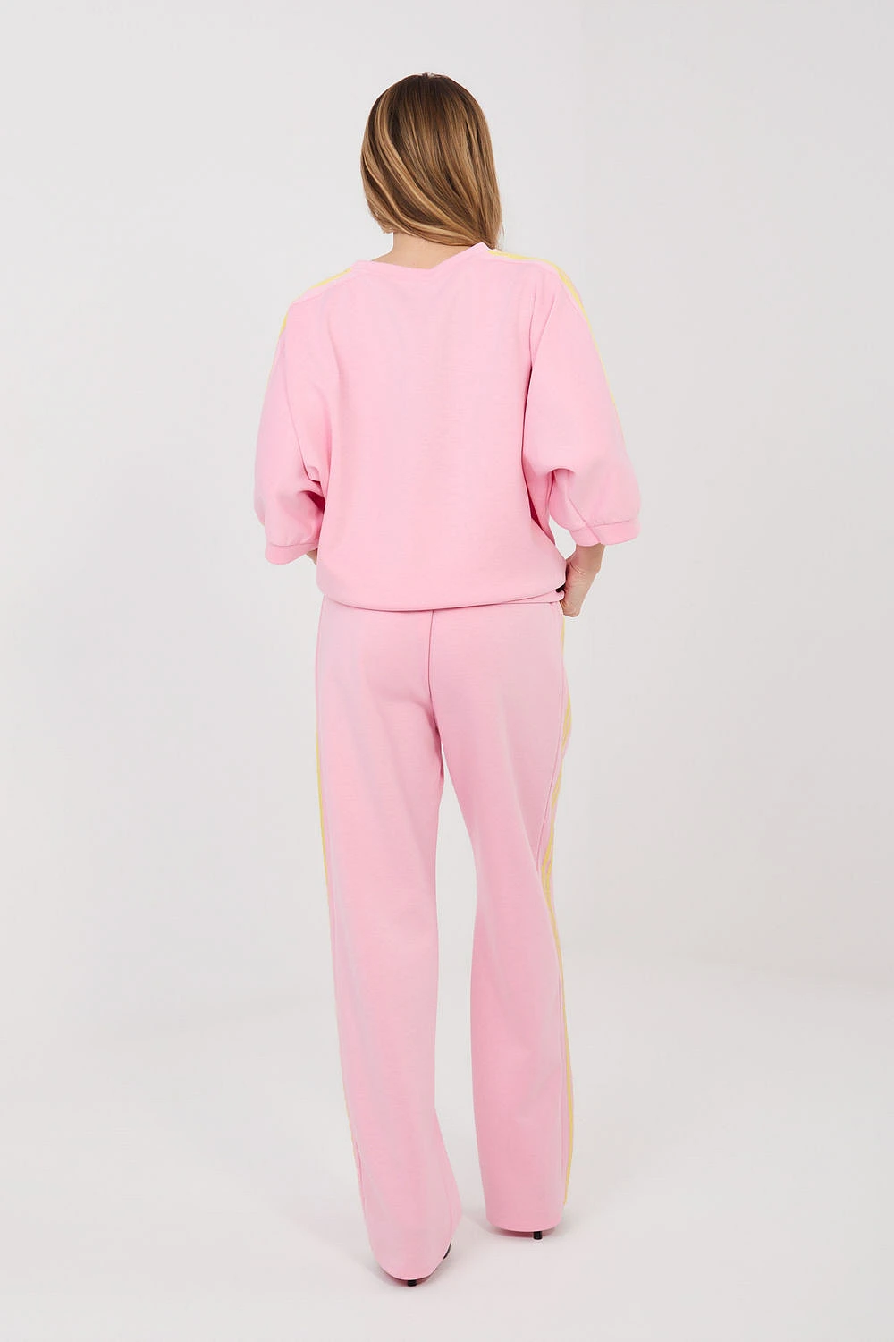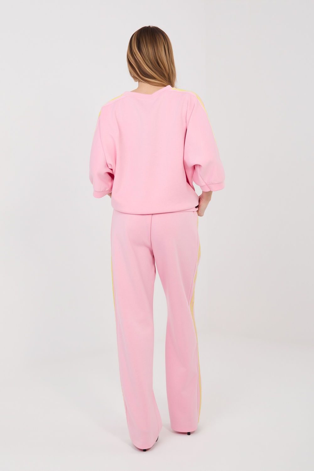 Dámský teplákový set skládající se z mikiny a kalhot, ideální pro každodenní stylování ve stylu casual. Hladký vzor činí set univerzální a snadno kombinovatelný s různými příležitostmi, od procházek přes nákupy až po domácí relaxaci. Set je vyroben z příjemné směsi polyesteru, viskózy a elastanu. Materiál typu "máslo" je mimořádně měkký, jemný a velmi příjemný na dotek, což zaručuje vysoký komfort nošení a volnost pohybu. Kalhoty mají vysoký pas a dlouhé rovné nohavice, které se dobře tvarují podle postavy. V pasu je praktické šňůrování pro přizpůsobení postavě. Model je také vybaven pohodlnými bočními kapsami. Mikina s dlouhým rukávem po loket, skvěle doplňuje celý set. Jako další dekorační prvek jsou moderní pruhy běžící podél rukávů a nohavic, které dodávají setu sportovní a moderní charakter.