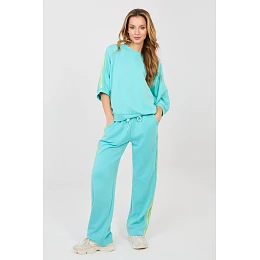 Dámský teplý set skládající se z mikiny a kalhot, ideální pro každodenní stylování v casual stylu. Hladký vzor dělá set univerzálním a snadno kombinovatelným s různými příležitostmi, od procházek přes nákupy až po domácí relaxaci. Set je vyroben z příjemné směsi polyesteru, viskózy a elastanu. Materiál typu "máslo" je mimořádně měkký, jemný a příjemný na dotek, což zaručuje vysoký komfort nošení a volnost pohybu. Kalhoty mají vysoký pas a dlouhé, přímé nohavice, které se dobře drží na postavě. V pasu je praktické šňůrkování pro přizpůsobení postavě. Model je také vybaven pohodlnými bočními kapsami. Mikina s dlouhým loktem dokonale doplňuje celý set. Dalším dekorativním prvkem jsou moderní pruhy po rukávech a nohavicích, které dodávají setu sportovní a moderní charakter.