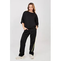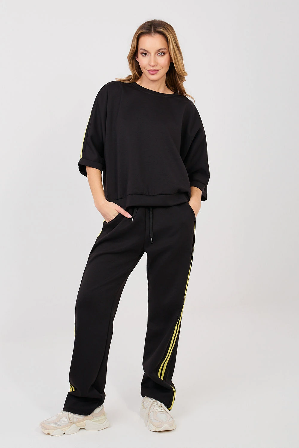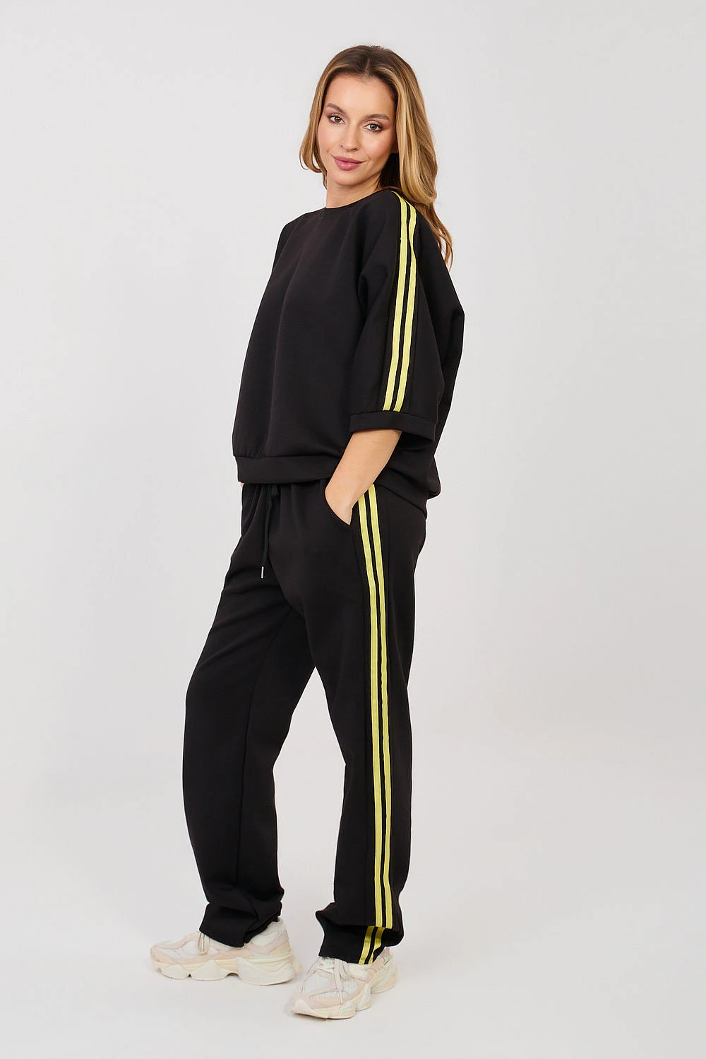 Dámský teplý set skládající se z mikiny a kalhot, ideální pro každodenní outfit v casual stylu. Hladký vzor dělá set univerzálním a snadno kombinovatelným s různými příležitostmi, od procházek, přes nákupy až po domácí relaxaci. Set je vyroben z příjemné směsi polyesteru, viskózy a elastanu. Materiál typu "máslo" je mimořádně měkký, jemný a příjemný na dotek, což zaručuje vysoký komfort nošení a volnost pohybu. Kalhoty mají vysoký pas a dlouhé, přímé nohavice, které se dobře tvarují podle postavy. V pasu mají praktické šňůrky pro přizpůsobení figuře. Model je také vybaven pohodlnými bočními kapsami. Mikina s dlouhým rukávem sahajícím za loket skvěle doplňuje celý set. Jako další dekorační prvek jsou módní pruhy po stranách rukávů a nohavic, které setu dodávají sportovní a moderní charakter.