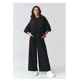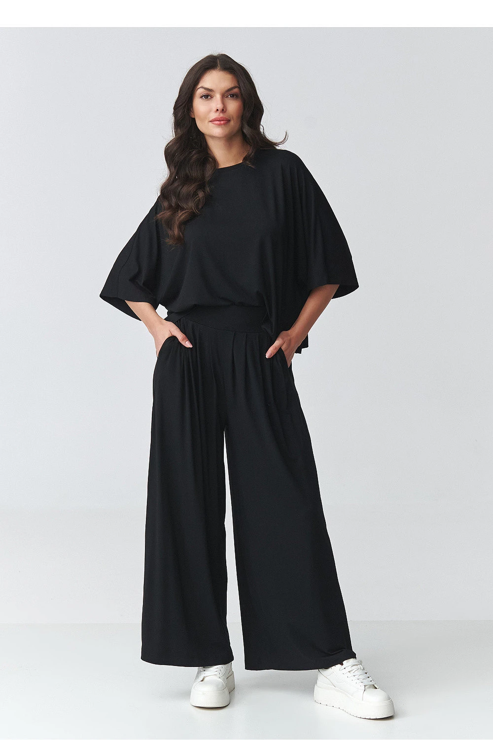 Stylový dámský komplet spojující pohodlí a moderní eleganci je ideálním návrhem pro ženy, které oceňují volnost pohybu a nadčasový design. Sestava se skládá z volné halenky s širokým střihem a kalhot s širokou nohavicí, vytvářející harmonický a módní styl na mnoho příležitostí. Halenka s volným střihem krásně padne na postavě, poskytující pohodlí přes celý den. Široké rukávy dodávají lehkost a zdůrazňují moderní charakter projektu. Kalhoty s vysokým pasem opticky prodlužují nohy, a elastický pas zaručuje ideální přizpůsobení. Široké nohavice dodávají elegantní a volný výraz stylizaci. Tento dámský komplet se skvěle hodí jak jako elegantní sada na každodenní nošení, tak i jako stylizace na obchodní schůzky, rodinné oslavy nebo večírky s přáteli. Díky univerzálnímu střihu můžete nosit komplet jako celek nebo kombinovat jeho části s jinými kousky oblečení, vytvářejíce různorodé stylizace.