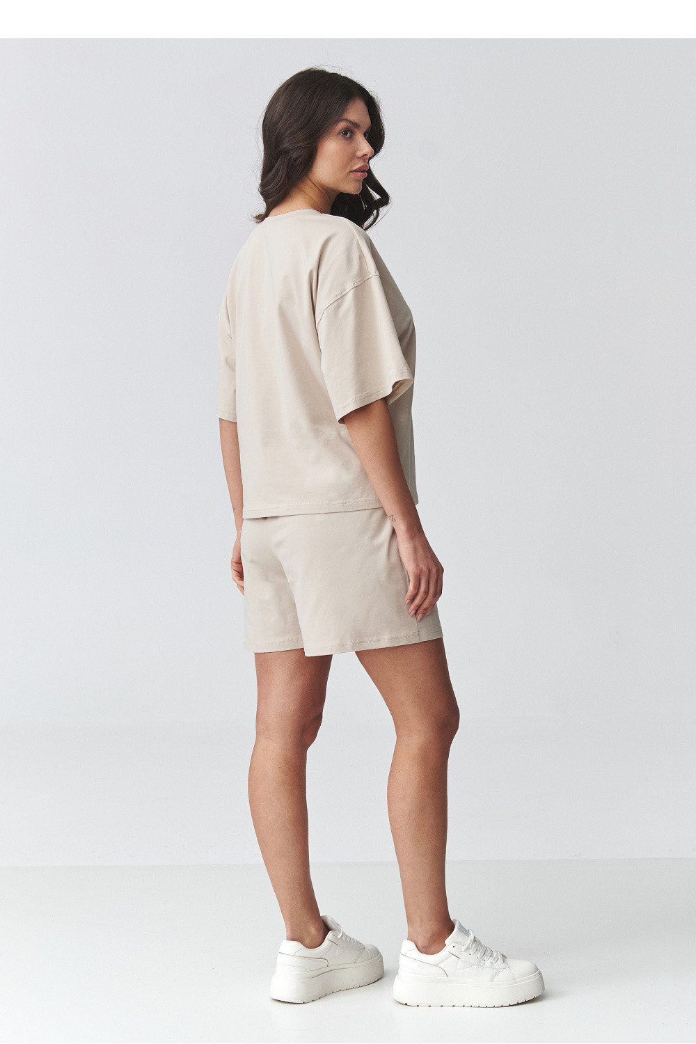Stylový dámský set skládající se z volné košile s krátkým rukávem a pohodlných šortek je ideální volbou pro ženy, které ocení pohodlí a módní vzhled. Hladká oversized košile s kulatým výstřihem poskytuje volnost pohybu a skvěle padne na postavě, vytvářejíc moderní, minimalistický vzhled. Dámské šortky s elastickým pasem zaručují ideální přizpůsobení a pohodlí po celý den. Volný střih a praktické kapsy zvyšují funkčnost setu, dělají ho skvělou volbou jak do každodenního života, tak během aktivního odpočinku. Tento sportovní dámský set se hodí jako stylizace na procházku, nákupy, výlet nebo relaxaci doma. V kombinaci se teniskami vytváří módní, městský outfit. Vsadte na pohodlný dámský set, který kombinuje pohodlí, univerzálnost a nadčasový střih.