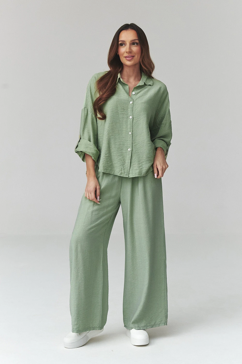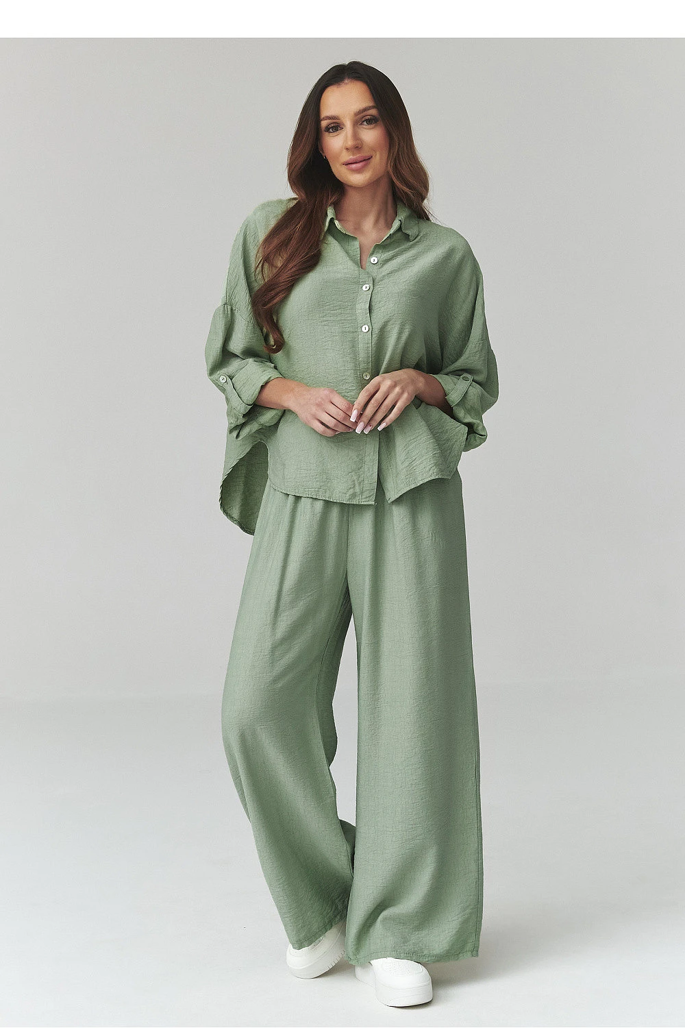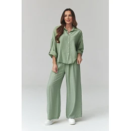 Stylový dámský komplet v moderních odstínech je ideální volbou na jaro a léto. Sestava se skládá z volné košile s knoflíky a širokých kalhot s elastickým pasem, co zaručuje maximální pohodlí a volnost pohybu. Vyrobeno z lehkého, prodyšného materiálu. Tkanina je měkká, prodyšná a příjemná k pokožce, díky čemuž poskytuje pohodlí po celý den. Tento dámský komplet s košilí a kalhotami je skvělý základ pro mnoho stylizací. Kombinujte ho se teniskami, sandály nebo žabkami, abyste vytvořili ležérní look, nebo přidejte elegantní doplňky pro sofistikovanější efekt. Vyrobeno v Itálii.