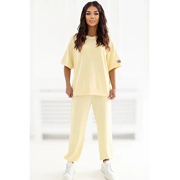 Dámský sportovní set skládající se z mikiny a kalhot je ideální nabídkou pro každodenní nošení pro ženy, které ocení pohodlí a moderní styl. Hladký střih mu dodává univerzální charakter, díky čemuž se skvěle hodí jak do domácího prostředí, tak i na vycházky do města. Mikina s krátkým rukávem a klasickým, kulatým výstřihem poskytuje pohodlí a volnost pohybu. Dalším akcentem je nášivka na rukávu, která celku dodává moderní vzhled. Kalhoty s dlouhým nohavicemi zakončené manžetami se skvěle přizpůsobí postavě. Model je vybaven praktickými bočními kapsami, které zvyšují jeho funkčnost. Set je vyroben z příjemné směsi viskózy a elastanu, což zaručuje pohodlí, elasticitu a ideální přizpůsobení. Model není zapínací, což dále podtrhuje jeho casualový, pohodlný charakter.