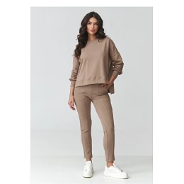 Stylový dámský teplákový set je ideální kombinací pohodlí a moderního designu. Sestava se skládá z volné mikiny s oversized střihem s prodlouženým zády a přiléhavých kalhot s přesýpkami, které krásně zdůrazňují postavu. Jedná se o skvělý návrh jak na každodenní nošení, tak i pro neformální městské outfity. Mikina má klasický, uzavřený výstřih a sníženou ramenní linii, což jí dodává módní a uvolněný charakter. Elastické zakončení na rukávech zajistí pohodlné nošení a dobré přizpůsobení. Kalhoty byly navrženy s ohledem na pohodlí, mají zužující se nohavice a praktické kapsy, které zvyšují funkčnost setu. Teplákový set se skvěle hodí na procházky, nákupy, cestování nebo jako stylový domácí oděv. Stačí si vybrat oblíbené tenisky nebo sportovní obuv a vytvořit tak módní a pohodlný vzhled.