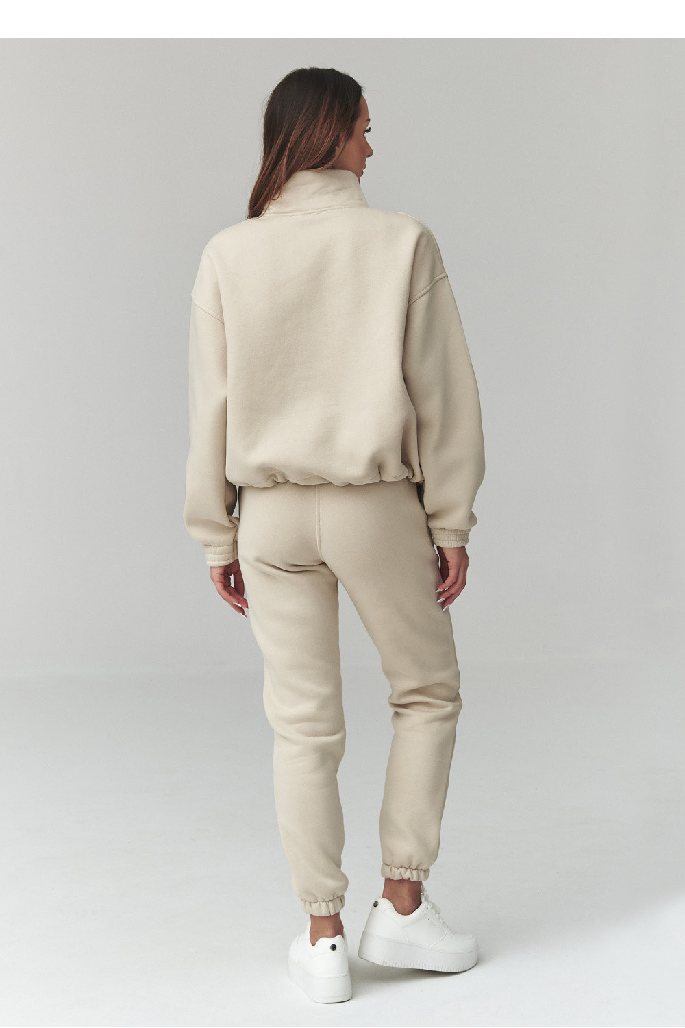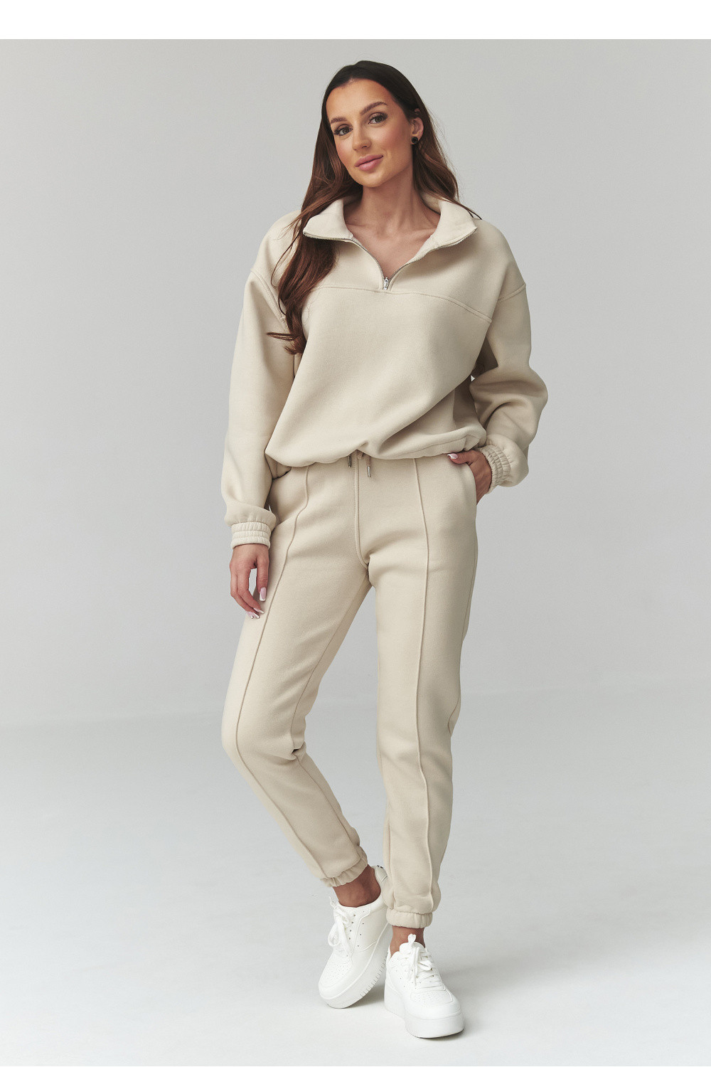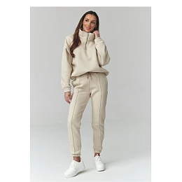 Stylový dámský teplákový set v univerzální velikosti je ideální kombinací pohodlí a módního vzhledu. Vyrobený z měkké, příjemné na dotek látky, skvěle poslouží jak na každý den, tak během víkendového odpočinku nebo cestování. Klasické barvy dodávají celku univerzální charakter a snadno se hodí k různým stylizacím. Další výhodou setu jsou ozdobné prošívání po stranách nohavic, které opticky prodlužují nohy. Mikina s volným střihem s krátkým zipem u krku a s regulací na šňůrky dole zajistí pohodlí nošení a módní, sportovně-pohodový vzhled. Teplákové kalhoty s elastickým pasem mají sevřené nohavice zakončené lemy, které zdůrazňují moderní vzhled.