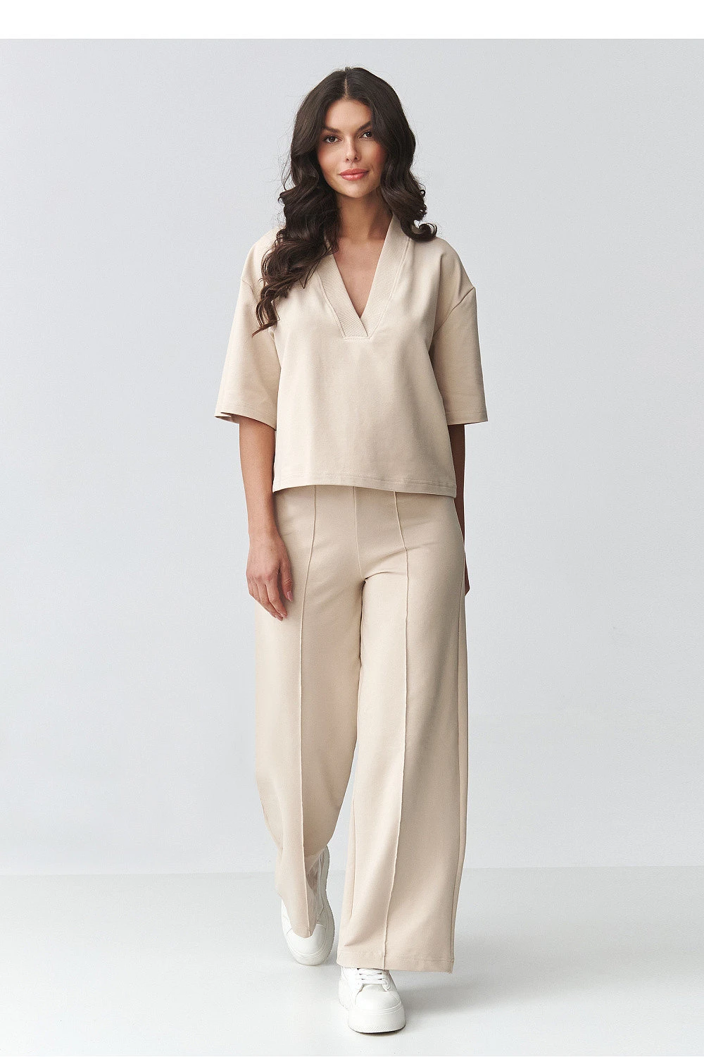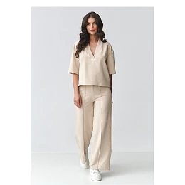 Elegantní dámský set s širokými kalhotami je ideální kombinací pohodlí a moderní elegance. Sestava se skládá z volné halenky s výstřihem ve tvaru písmene V a kalhot s širokými nohavicemi, které krásně prodlužují siluetu a dodávají stylizaci lehkost. Tento elegantní dámský set se hodí jak do každodenního nošení, tak i na formální události. Je to skvělá volba do práce, na schůzku, procházku nebo výlet. Minimalistický střih umožňuje vytvářet různé stylizace, ve sportovní verzi s teniskami nebo ve více elegantní s elegantní obuví. Volný střih halenky zajišťuje pohodlí při nošení a jemně zdůrazňuje linii výstřihu, zatímco dámské kalhoty s širokými nohavicemi zaručují pohodlí a moderní, nadčasový vzhled. Celkově vytváří souvislý volný dámský set, který spojuje pohodlí s elegancí.