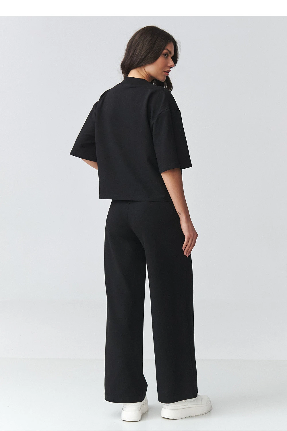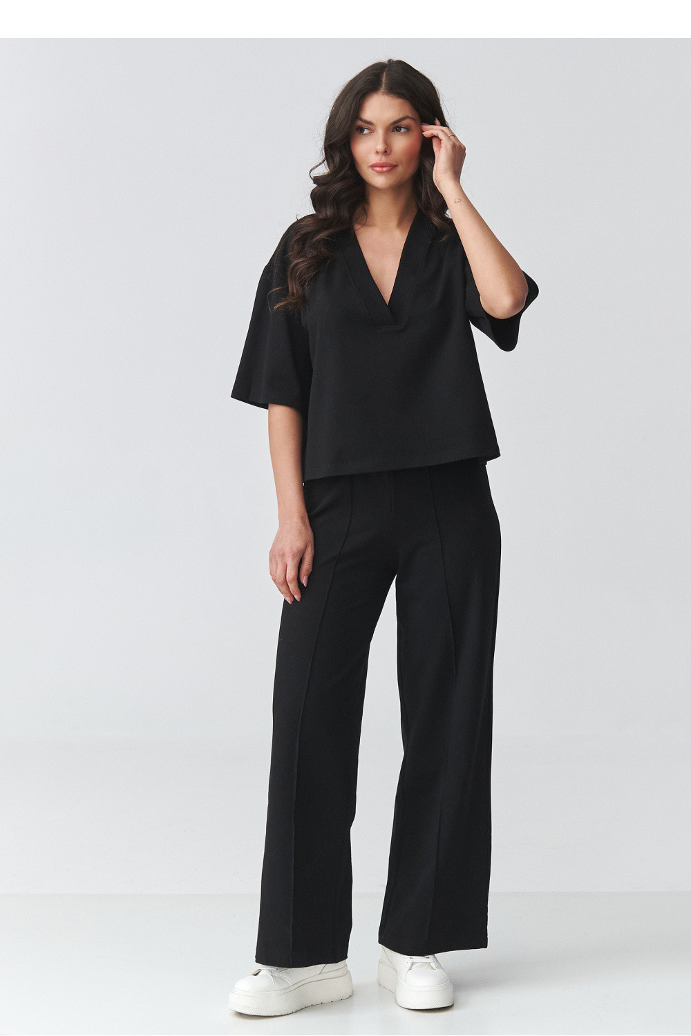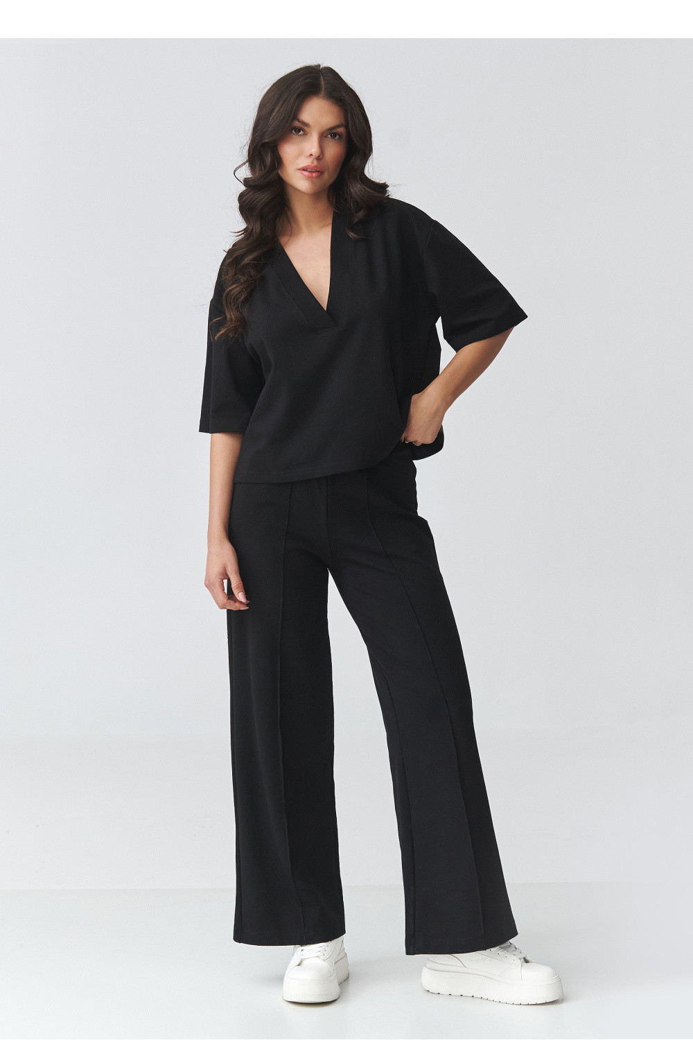 Elegantní dámský set s širokými kalhotami je ideální kombinací pohodlí a moderní elegance. Sada se skládá z volného topu s výstřihem ve tvaru písmene V a kalhot s širokými nohavicemi, které krásně prodlužují postavu a dodávají stylizaci lehkost. Tento elegantní dámský set je vhodný jak na každý den, tak i na formální události. Je to skvělá volba do práce, na schůzku, procházku nebo výlet. Minimalistický střih umožňuje vytvářet různé stylizace, ve sportovní verzi s teniskami nebo elegančnější s elegantní obuví. Volný střih topu zajišťuje pohodlí nošení a decentně zdůrazňuje linii výstřihu, zatímco široké dámské kalhoty zaručují pohodlí a módní, nadčasový vzhled. Celkově vytváří ucelený volný dámský set, který spojuje pohodlí s elegancí.