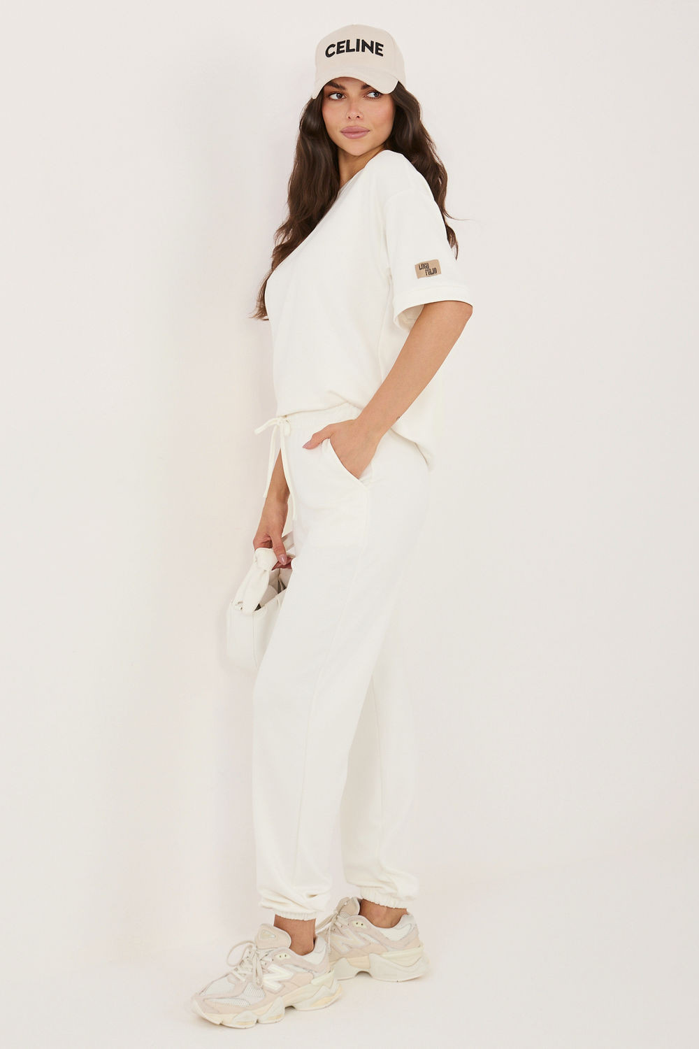 Dámský dresový set skládající se z mikiny a kalhot je ideální nabídkou pro ženy, které ocení pohodlí a moderní styl každý den. Hladký střih mu dodává univerzální charakter, díky čemuž se skvěle hodí jak do domácích outfitů, tak i do městských výletů. Mikina s krátkým rukávem a klasickým, kulatým výstřihem zajistí pohodlí nošení a volnost pohybů. Dalším akcentem je nášivka na rukávu, která dodává celku moderní vzhled. Kalhoty s dlouhými nohavicemi zakončenými lemy skvěle sedí. Model je vybaven praktickými bočními kapsami, které zvyšují funkcionalitu. Set je vyroben z příjemné směsi viskózy a elastanu, což zaručuje pohodlí, pružnost a ideální přizpůsobení. Model bez zapínání, což ještě více zdůrazňuje jeho ležérní, pohodlný charakter.