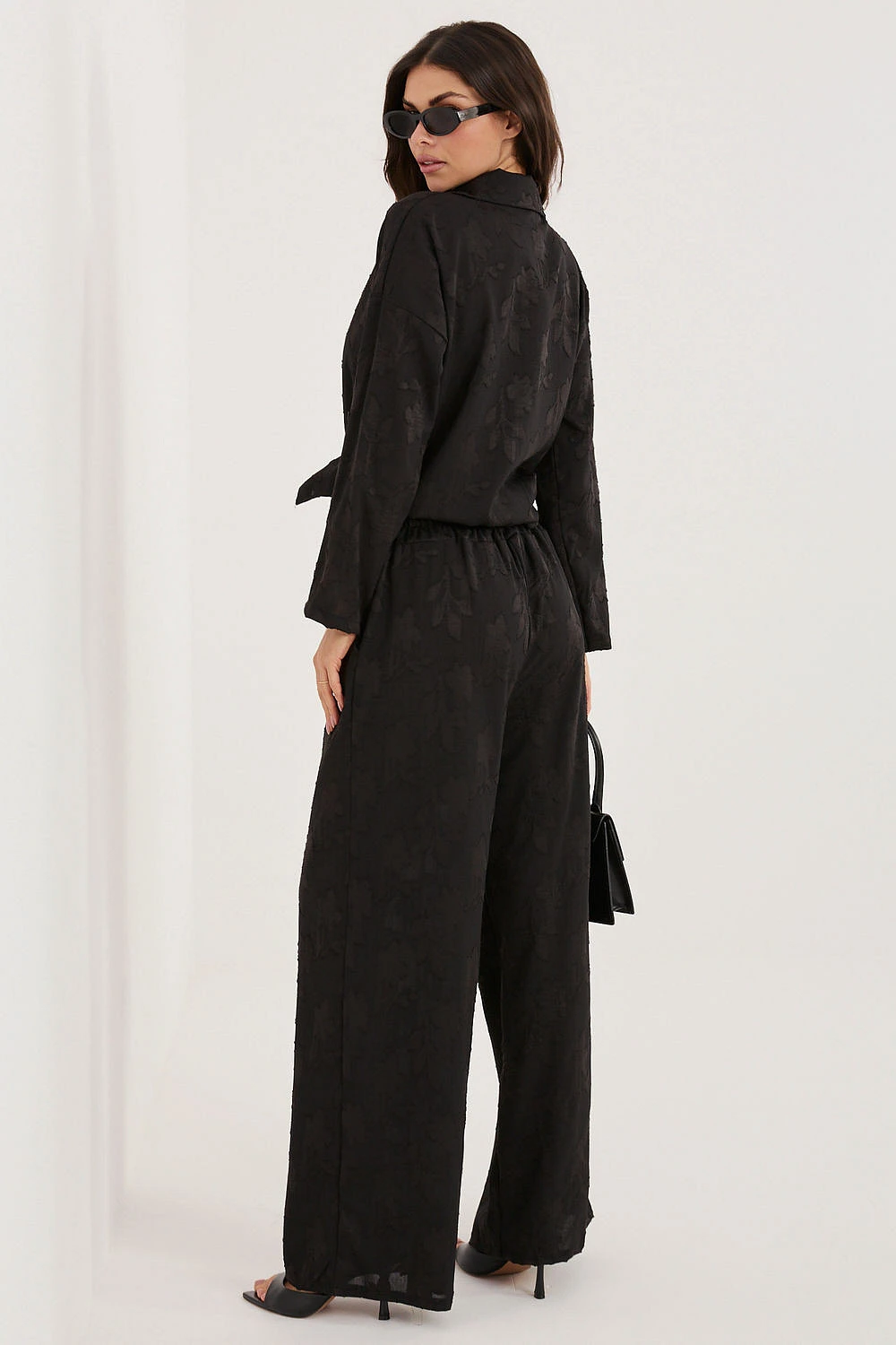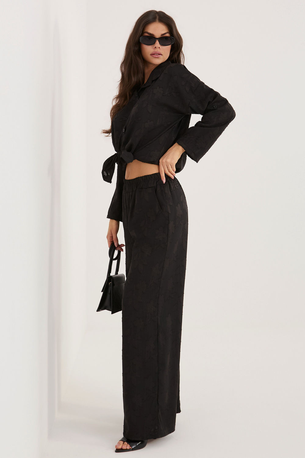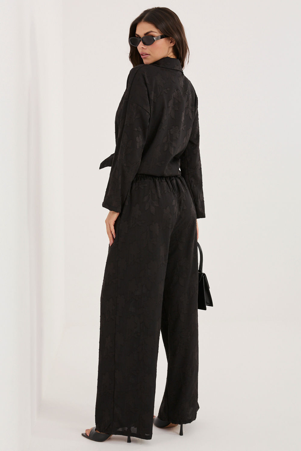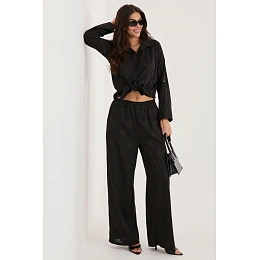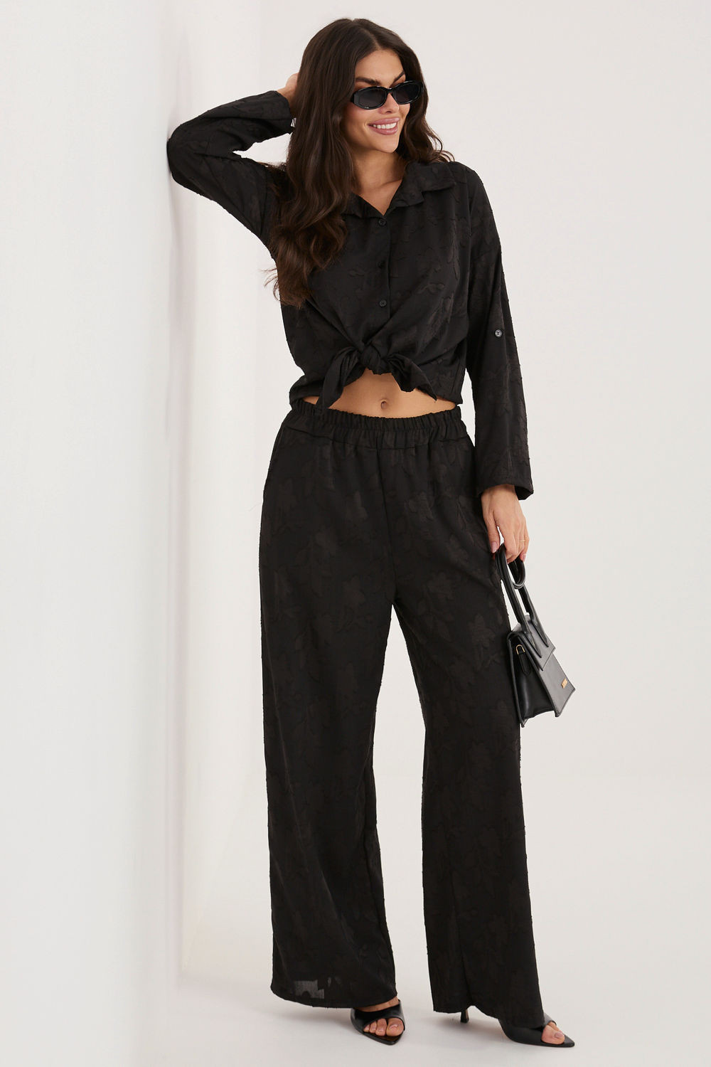 Dámský set skládající se z košile a kalhot je stylovým a pohodlným návrhem na každý den. Vyniká pestrou fakturou materiálu, která dodává celku moderní a originální charakter. Košile s dlouhým rukávem, klasickým límcem a zapínáním na knoflíky vypadá elegantně, ale zároveň volně, díky čemuž se skvěle hodí jak do každodenního, tak i do více upravených stylizací. Kalhoty s dlouhými nohavicemi jsou vybaveny elastickým pasem s všitou gumou, co zajišťuje pohodlné přizpůsobení postavě a pohodlí nošení po celý den. Navíc mají praktické, boční kapsy. Set vyrobený z měkké a příjemné na dotek směsi viskózy a elastanu zaručuje lehkost, pružnost a volnost pohybů. Je to ideální volba pro ženy, které ocení pohodlí spojené s módním vzhledem.