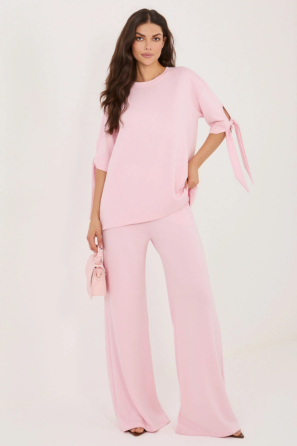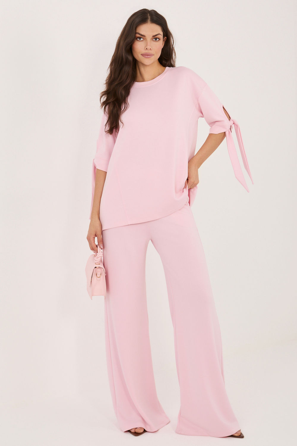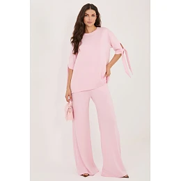 Dámský set skládající se z blůzy a kalhot je pohodlný a stylový návrh na každý den i do práce. Vyrobený z měkké a příjemné látky s přídavkem viskózy a elastanu zaručuje pohodlí nošení, volnost pohybů a dobrou přizpůsobivost postavě. Blůza má klasický, kulatý výstřih a rukávy délky 3/4 zakončené vázáním, co dodává celku jemně ženský charakter. Hladký materiál dělá set minimalistický a elegantní, díky čemuž je snadné ho sladit s různými stylizacemi. Kalhoty mají dlouhé a široké nohavice a praktické kapsy vsunuté po bocích, co zvyšuje funkčnost modelu. V pase je vsazena elastická guma, co zaručuje pohodlné přizpůsobení bez tlaku. Jedná se o univerzální set ideální jak pro každodenní stylizace, tak i do práce, spojující pohodlí s moderním, uklizeným vzhledem.