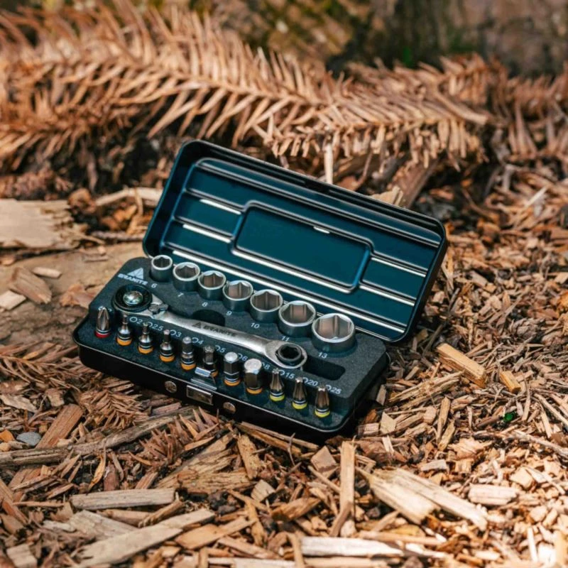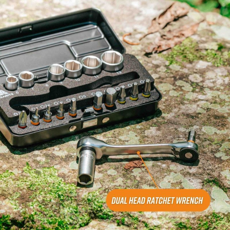 Komplexní sada: Obsahuje dvojitý ráčnový klíč, prodlužovací tyč, 7 šestihranných nástrčných hlavic, 7 šestihranných bitů, 3 hvězdicové bity a křížový bit.