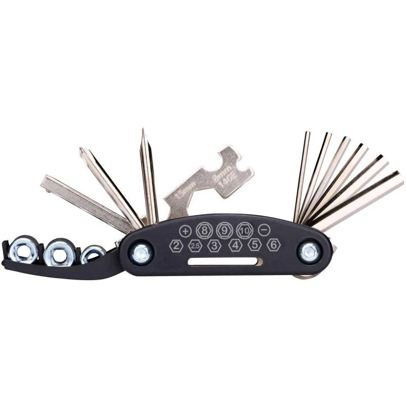 - 1x multifunkční nářadí: klíč velikosti 8, 10 a 15 mm, nástrčný adaptér s nástrčnými hlavicemi 8, 9 a 10 m. imbusový klíč 2, 5, 3, 4 a 6 mm. plochý a křížový šroubovák