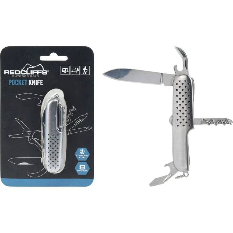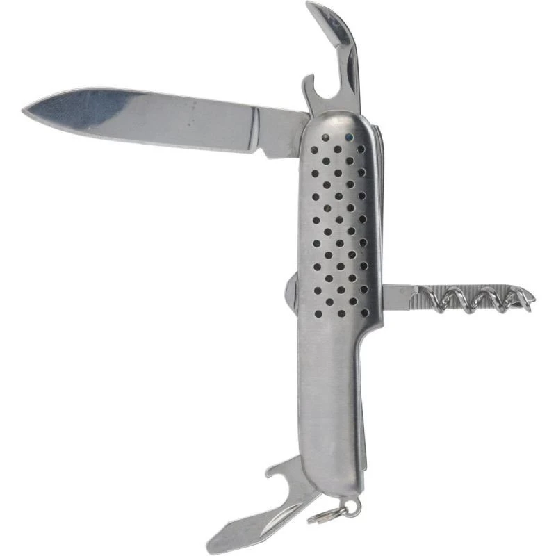 Zestaw zawiera: śrubokręt płaski, otwieracz do butelek, narzędzie do czyszczenia paznokci, śrubokręt krzyżowy, otwieracz do puszek, nóż, nożyczki, korkociąg.