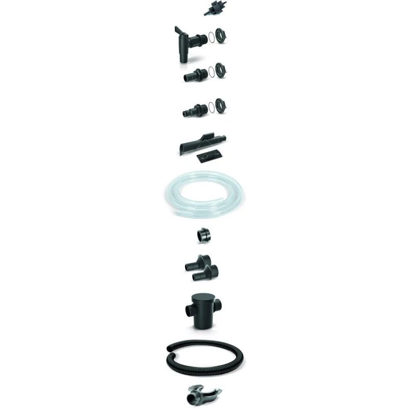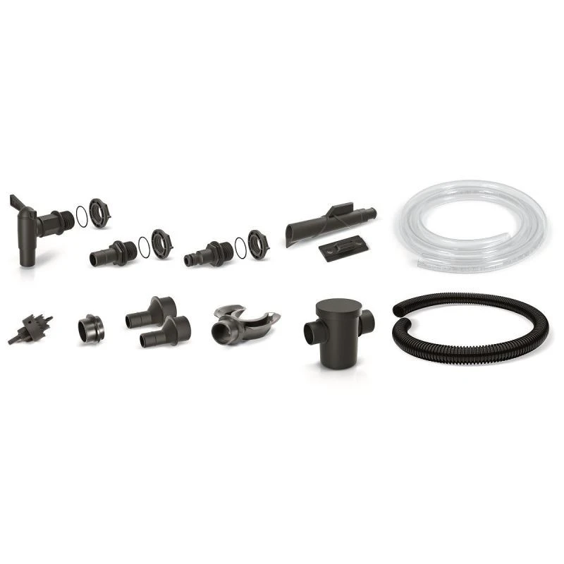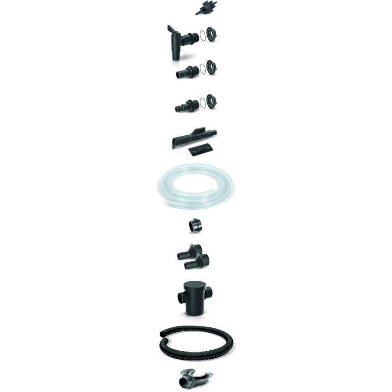 - Sada obsahuje: otvor, kohoutek, univerzální přípojky x 2, zahradní hadice, výtoková trubice, závěs, redukce, hadice, vnější filtr, záchytný koš