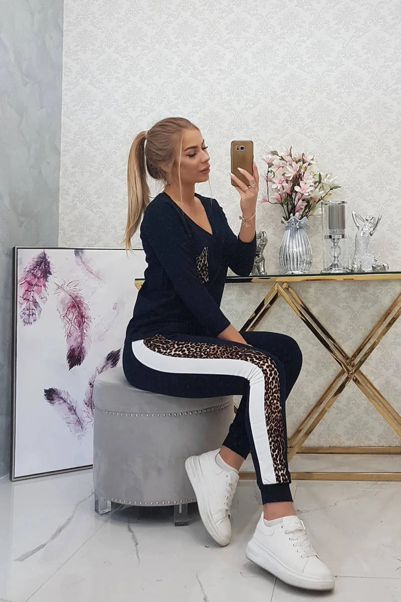 Představujeme vám sadu halenky a kalhot. Sada má vložky s motivem pantera. Halenka s kapsičkou na přední straně. Kalhoty mají kapsy. Sada je vyrobena z vysoce kvalitního materiálu. Velikost je univerzální a vyhovuje dámám, které nosí velikost S, M nebo L.