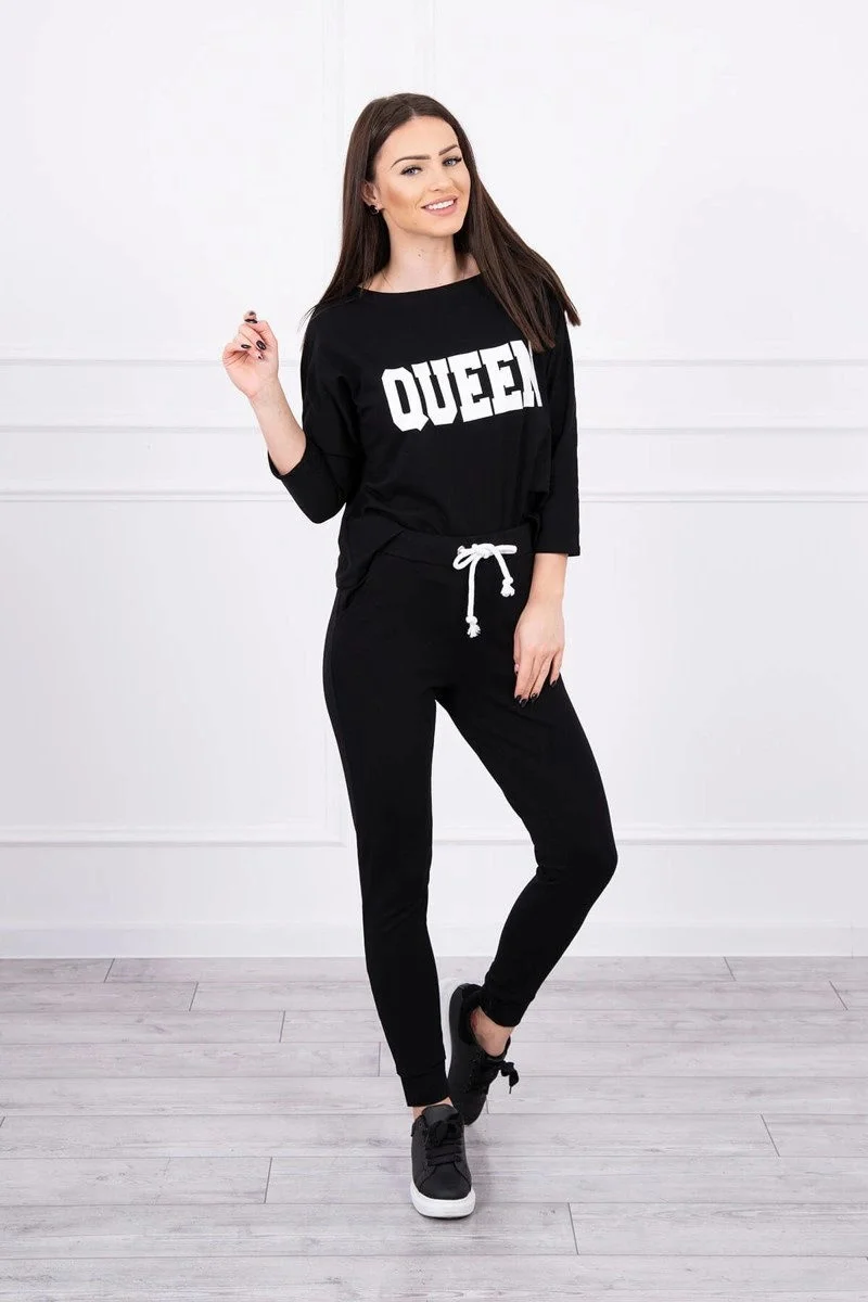 Představujeme vám sadu halenky a kalhot. Oversize halenka s potiskem Queen. Kalhoty s kapsami a zavazováním v pase. Sada je vyrobena z vysoce kvalitního materiálu. Velikost je univerzální a vyhovuje dámám velikosti S, M nebo L.