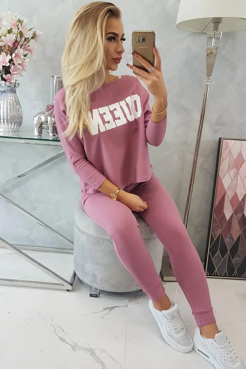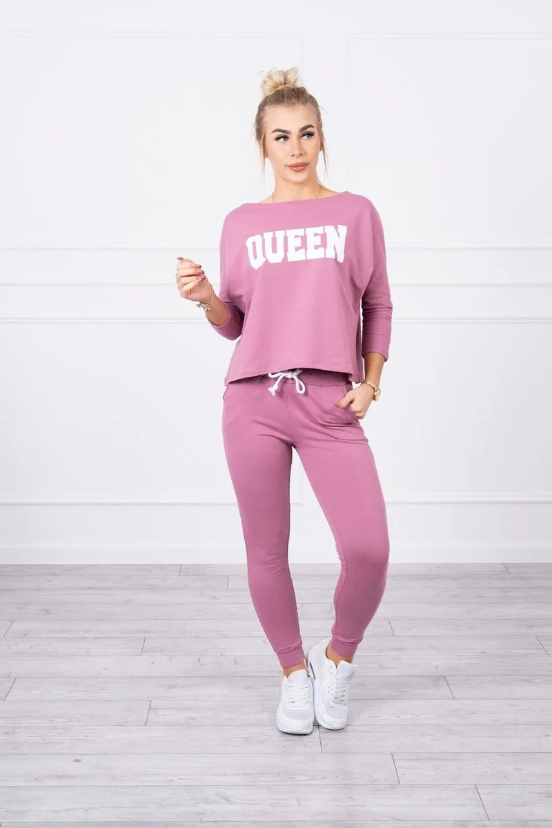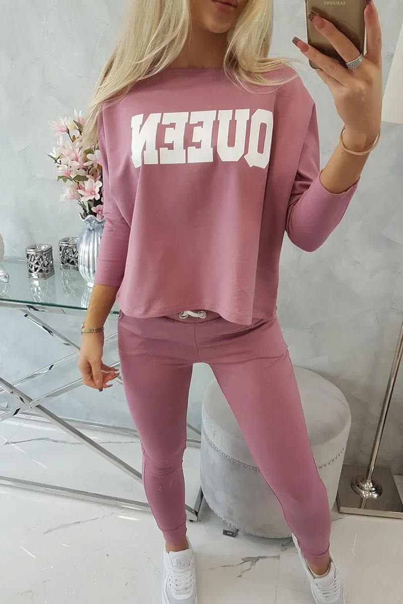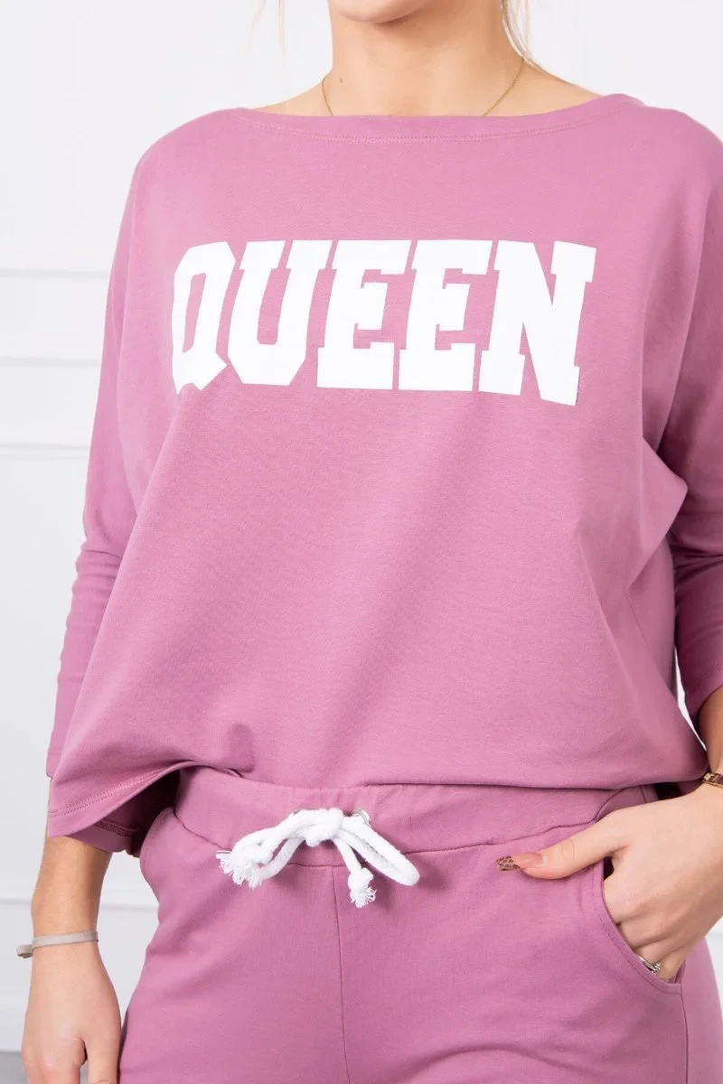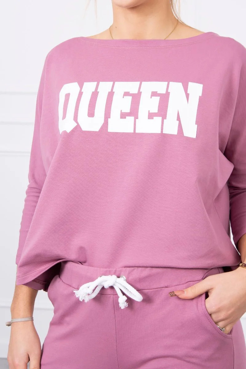 Prezentujemy Państwu komplet bluzki i spodni. Bluzka oversize, posiada nadruk Queen. Spodnie z kieszeniami i wiązaniem w pasie. Komplet wykonany jest z wysokiej jakości materiału. Rozmiar jest uniwersalny i będzie odpowiedni dla Pań w rozmiarze S, M lub L.