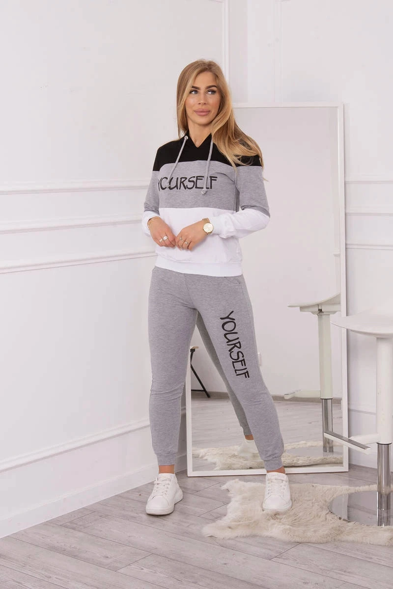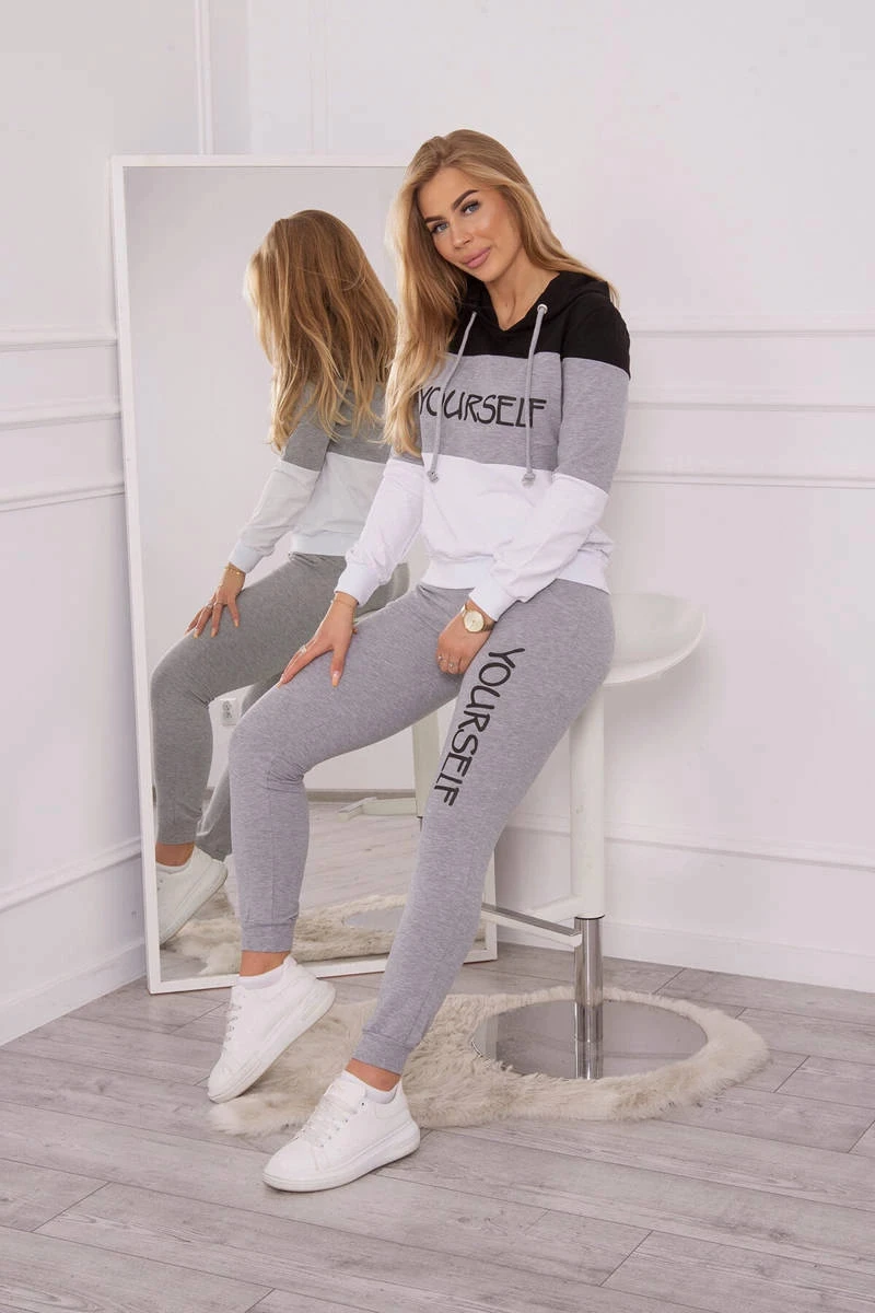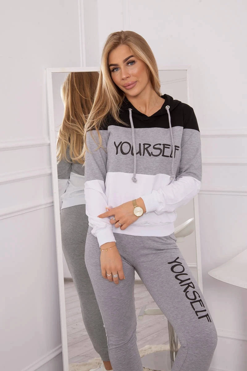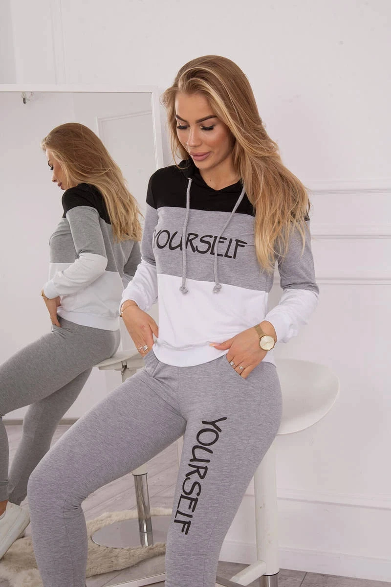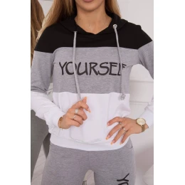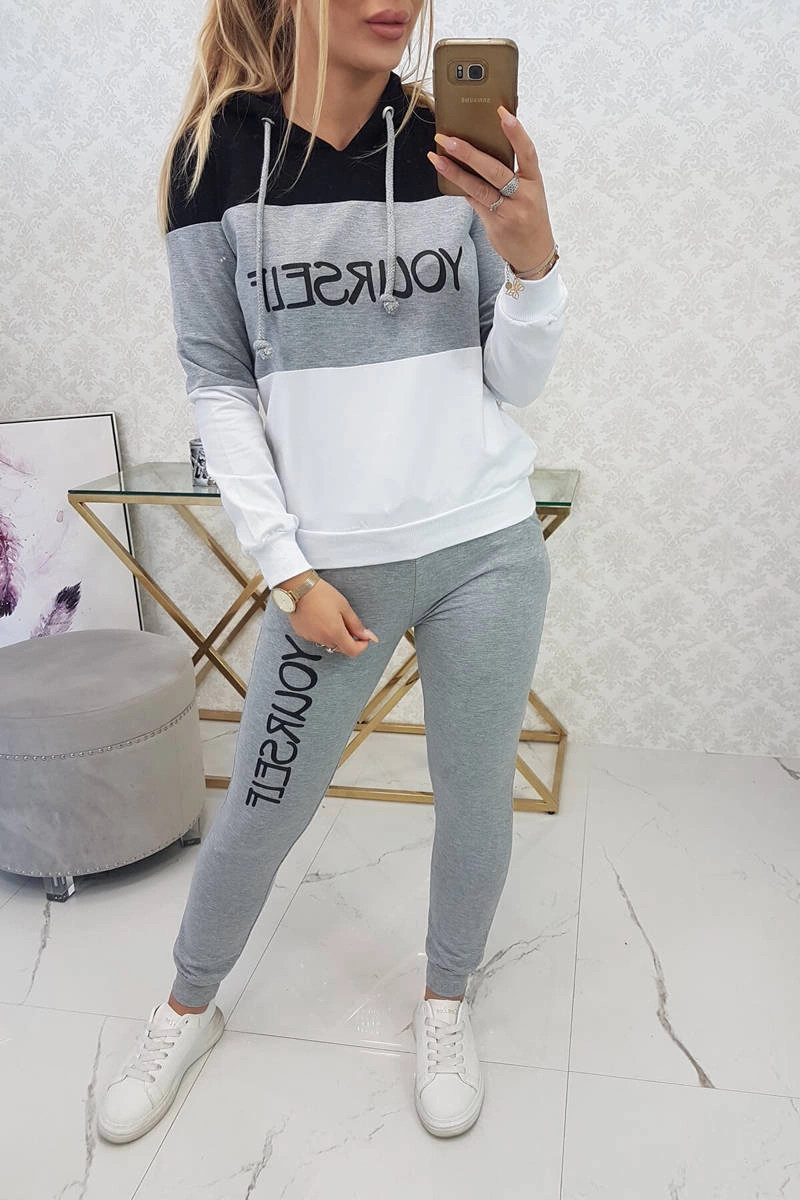 Představujeme vám sadu mikiny a kalhot. Na mikině je napsáno Yourself. Kalhoty s kapsami. Kalhoty také s potiskem. Sada je vyrobena z vysoce kvalitního materiálu. Velikost je univerzální a vyhovuje dámám, které nosí velikost S, M nebo XL