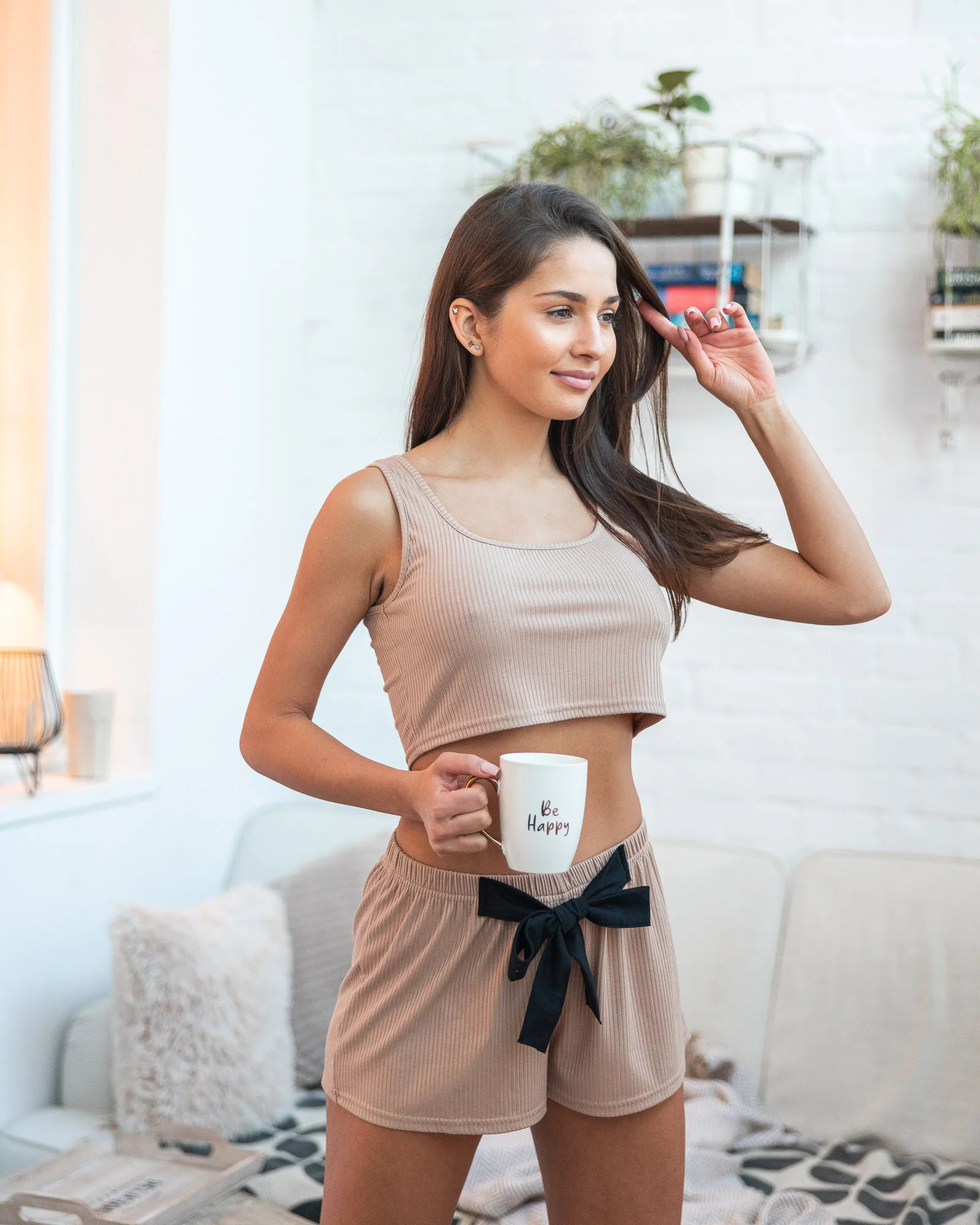 Co na sebe hodit, když je v bytě teplo a za oknem krásné počasí? - Podívejte se na sadu Lucia od společnosti Sensis. Sada obsahuje sexy top s širšími ramínky a koketní šortky s elastickým pasem a černým tropem v pase, které si můžete zavázat na sladkou mašli. Béžová (cappucino) barva, měkká, žebrovaná tkanina, velmi zajímavá. Složení: 62 % polyester, 33 % viskóza, 5 % elastan.