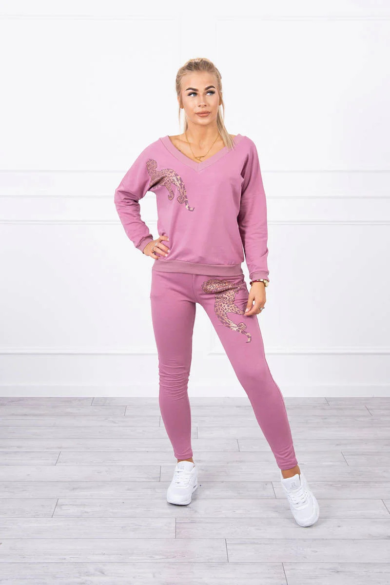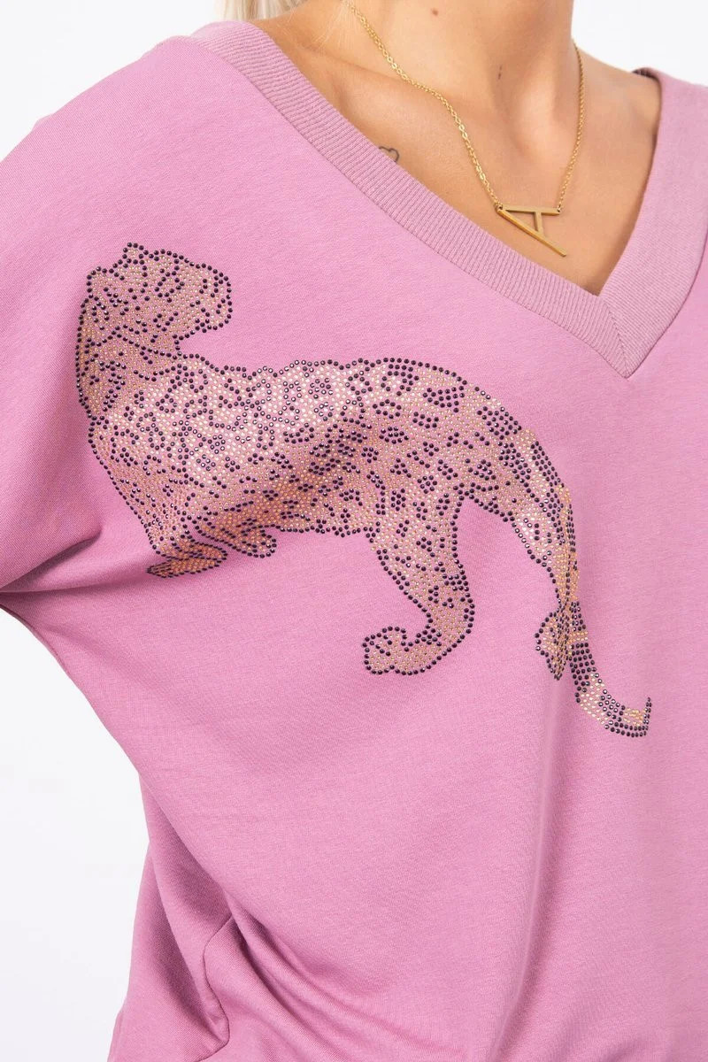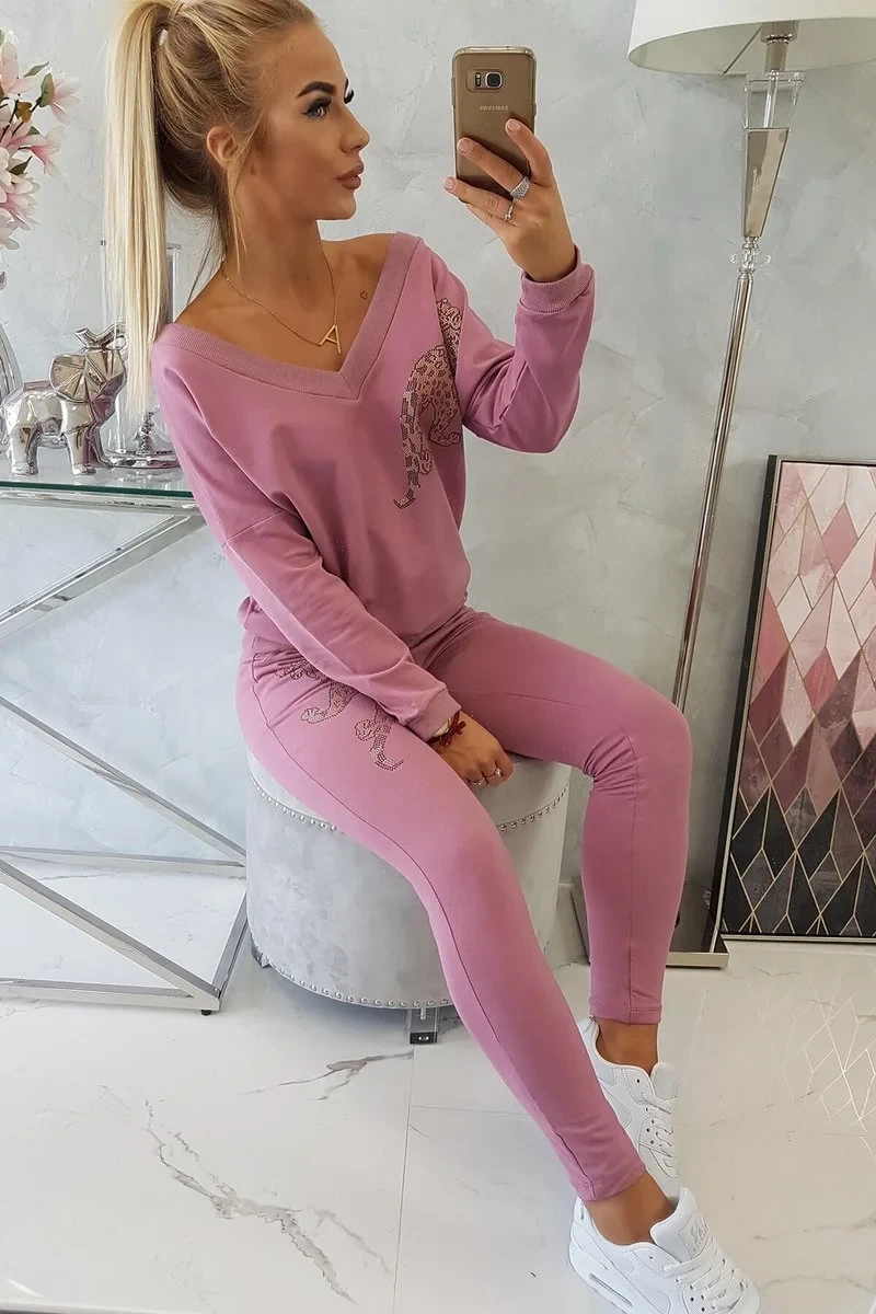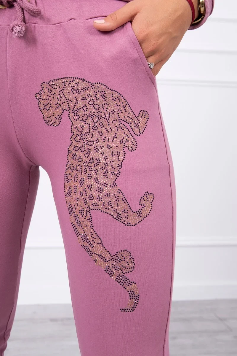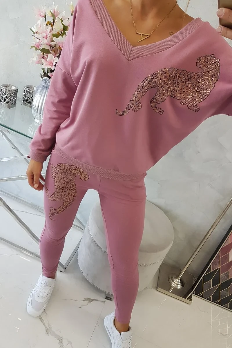 Prezentujemy Państwu komplet bluzy i spodni. Bluza oraz spodnie posiadają panterę z cyrkonii. Spodnie z kieszeniami i wiązaniem w pasie. Bluza z dekoltem V. Komplet wykonany jest z wysokiej jakości materiału. Rozmiar jest uniwersalny i będzie odpowiedni dla Pań w rozmiarze S, M lub L.