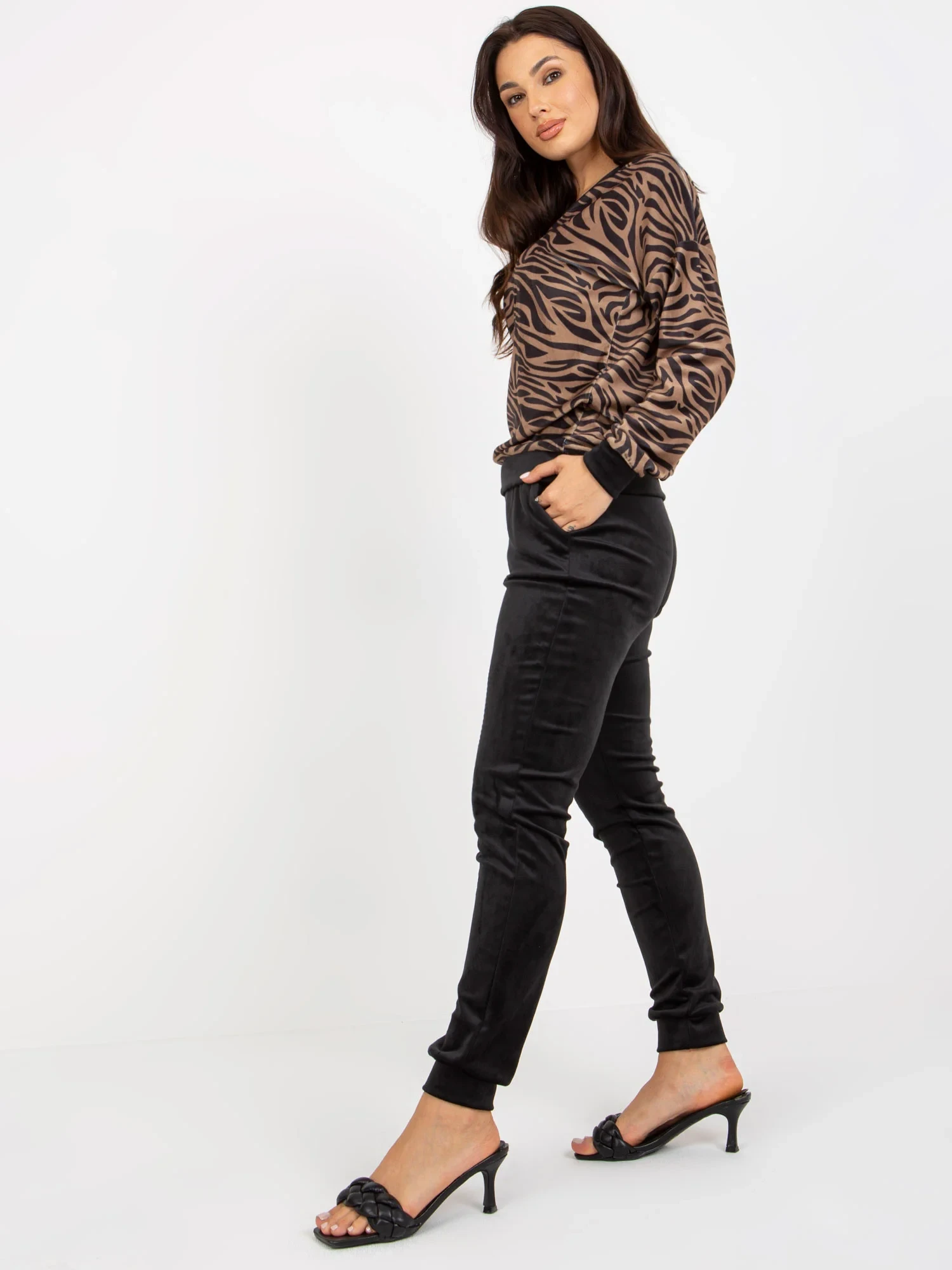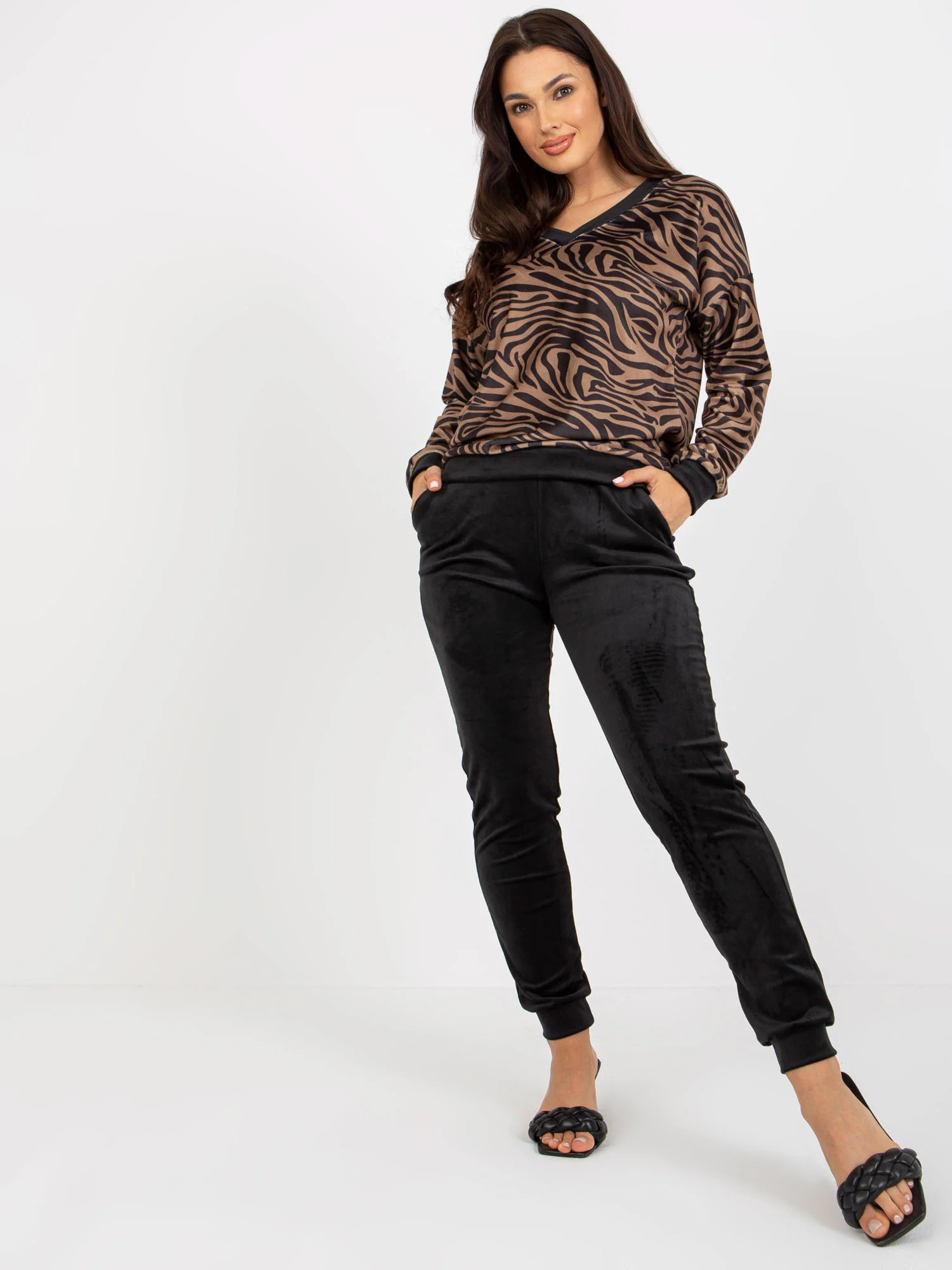 Rozměry soupravy ve velikosti S měřené na plocho: šířka v podpaží - 56 cm, délka halenky - 62 cm, délka rukávů - 55 cm, šířka v pase - 33 cm, výška nohavic - 30 cm, délka kalhot - 97 cm.