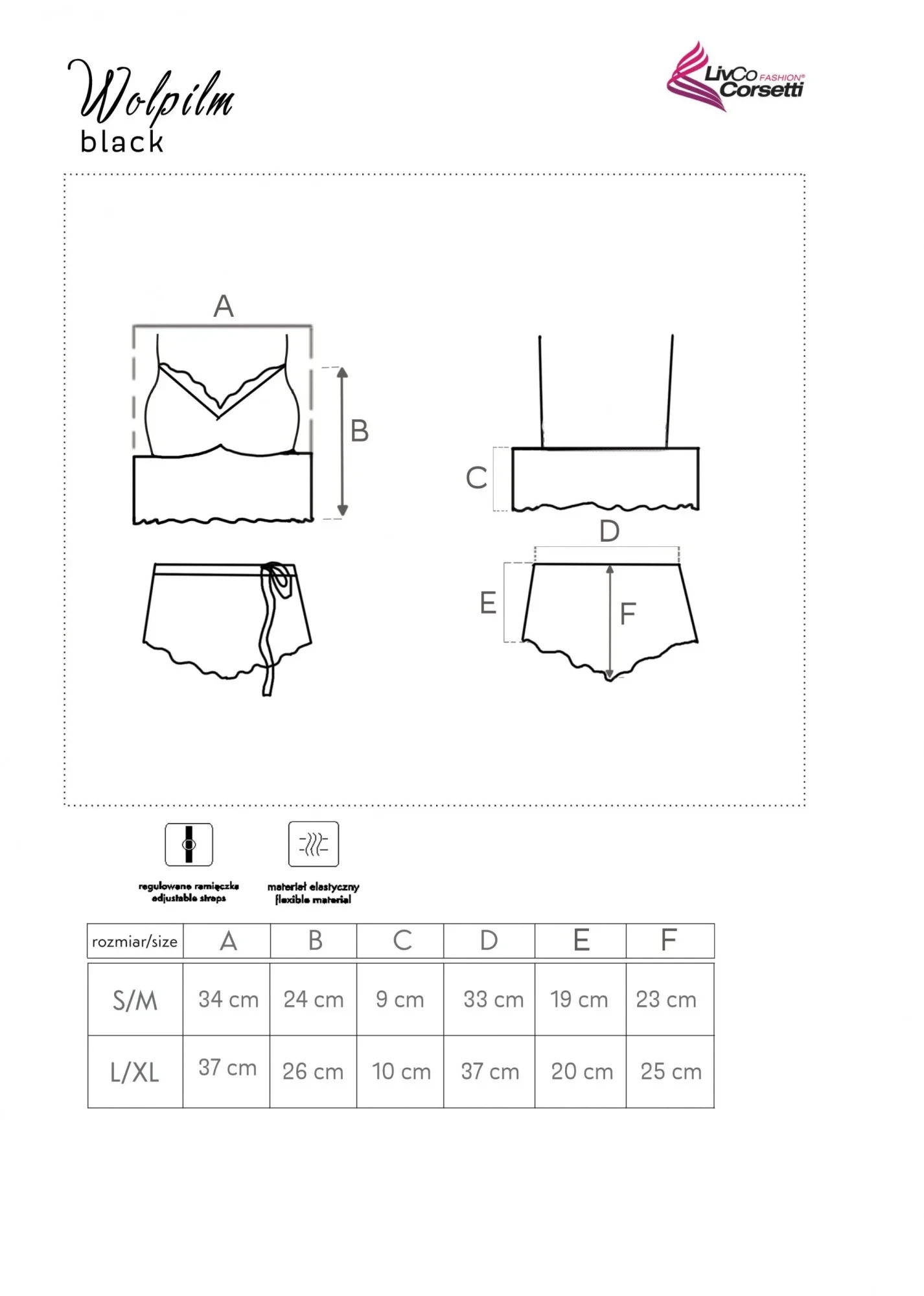 Smyslná, mimořádně ženská dvoudílná souprava spodního prádla z jemné krajky. Podprsenka v podobě topu na tenkých, nastavitelných ramínkách. Měkké košíčky smyslně zdůrazňují prsa ve výstřihu. Elastický pásek na lemu, díky němuž celá souprava působí sexy. Spodní díl, o něco plnější, s ozdobným zavazováním, imituje minisukni. Složení: 100% polyamid.