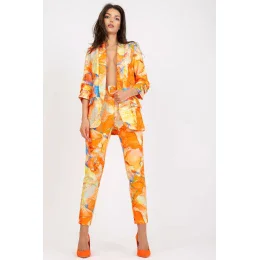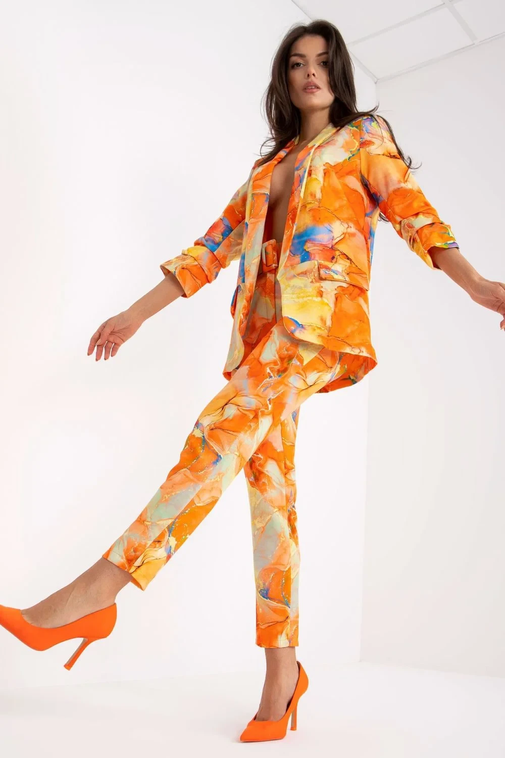 Bunda rovného střihu z barevné látky s podšívkou. Polštáře a záhyby na ramenou. Sako s 3/4 rukávy, bez knoflíku. K soupravě se hodí kalhoty stejné barvy.