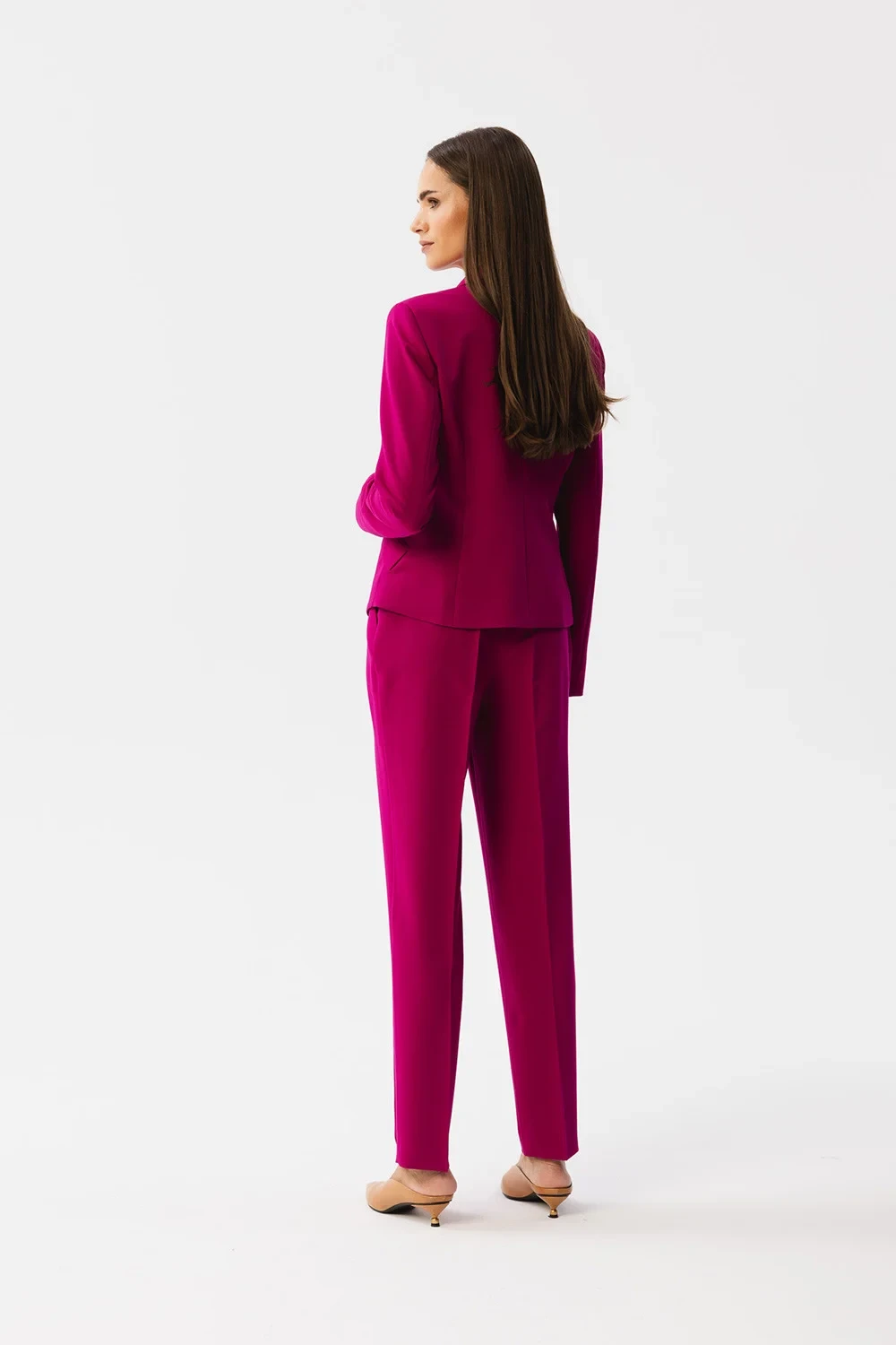 Tato bunda je kombinací elegance a modernosti. Je vyrobena z vysoce kvalitní tkaniny a vypadá výjimečně. Má krátký a asymetrický střih, který mu dodává originalitu. Klasický límec dodává eleganci a styl. Zapínání na jeden knoflík je praktické a dodává saku na eleganci. Dlouhé rukávy jsou univerzální a umožňují různé stylizace. Na přední straně jsou imitace kapes s klopami, které dodávají charakter. Sako je plně podšité pro pohodlné nošení a povrchovou úpravu. Je ideální volbou pro různé příležitosti, od formálních schůzek až po neformálnější situace, a dodá vám sebevědomí a eleganci. Navrženo a ušito v Polsku.