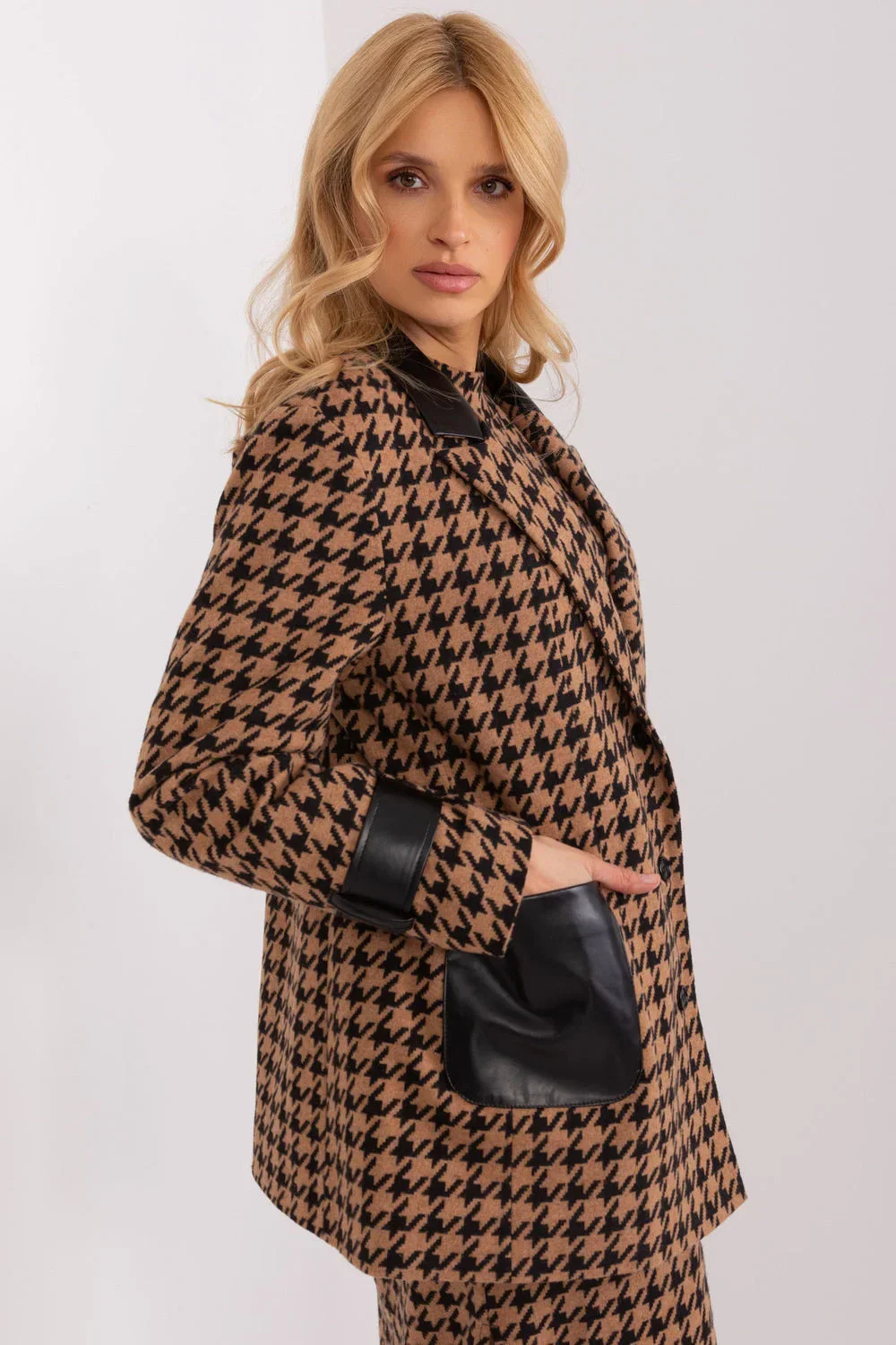 Dámská bunda s dlouhými rukávy a vycpaným límcem. Bunda se zapíná na knoflíky a má podšívku. Bunda má nakládané kapsy. Bunda je vyrobena z peplum tkaniny s lemováním z ekokůže.