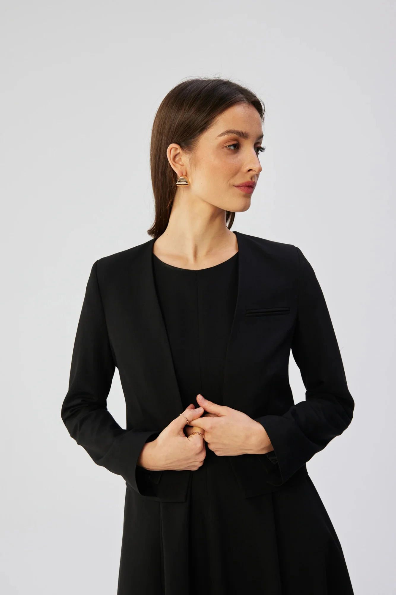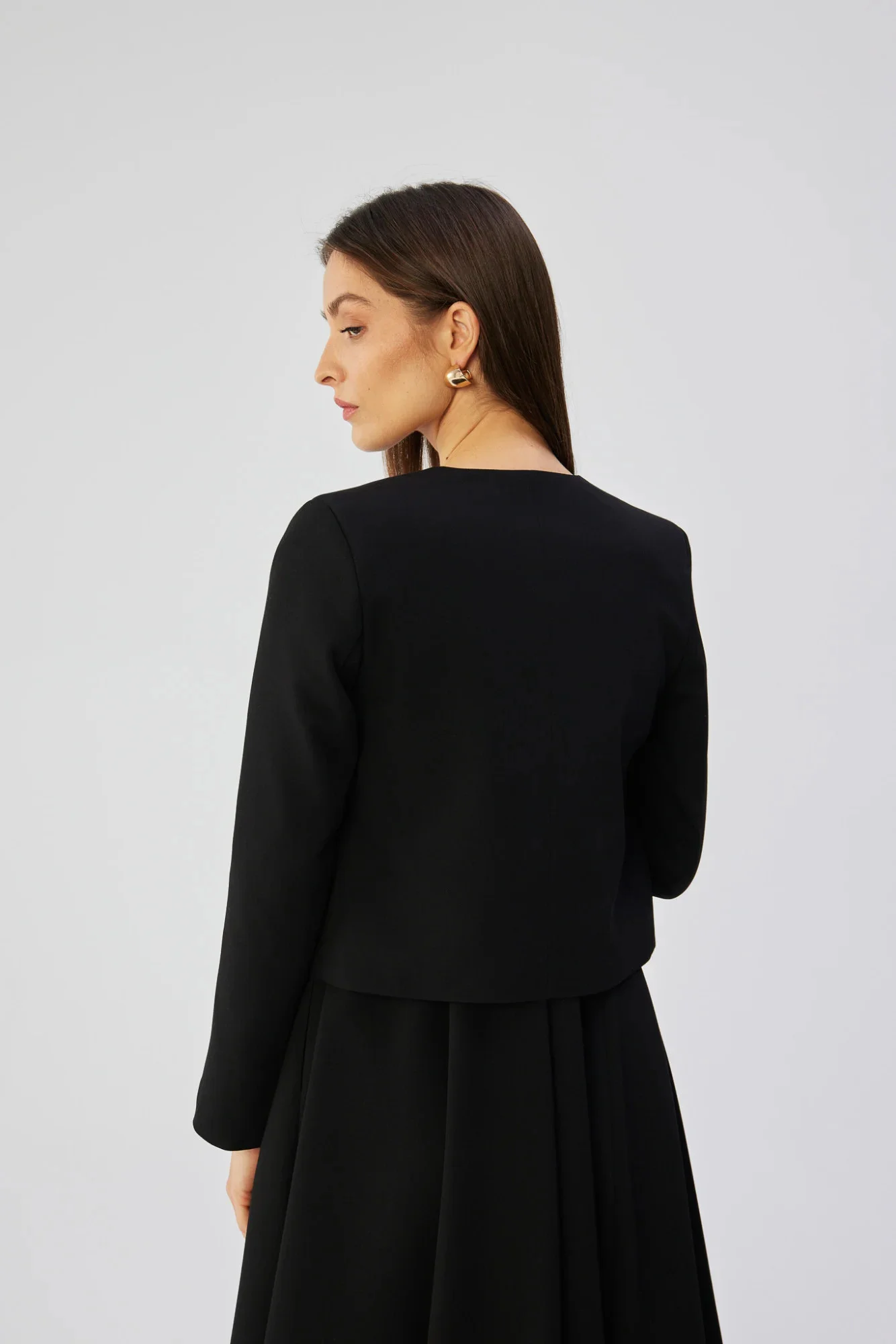 Krátká bunda je jedinečný kousek oděvu, který se vyznačuje krátkým střihem, jenž mu dodává moderní a dynamický vzhled. Díky absenci límce a tradičního zapínání vypadá toto sako stylově a neformálně. Její dlouhé rukávy jí dodávají eleganci při zachování lehkého charakteru. Vpředu na hrudi je imitace kapsy, která bundě dodává nádech ležérní elegance. Celá bunda je pečlivě dokončena a podšita, což zajišťuje nejen estetický vzhled, ale také pohodlné nošení. Je ideální volbou pro ty, kteří hledají elegantní a zároveň ležérní kousek šatníku, ideální pro různé příležitosti. Navrženo a ušito v Polsku.