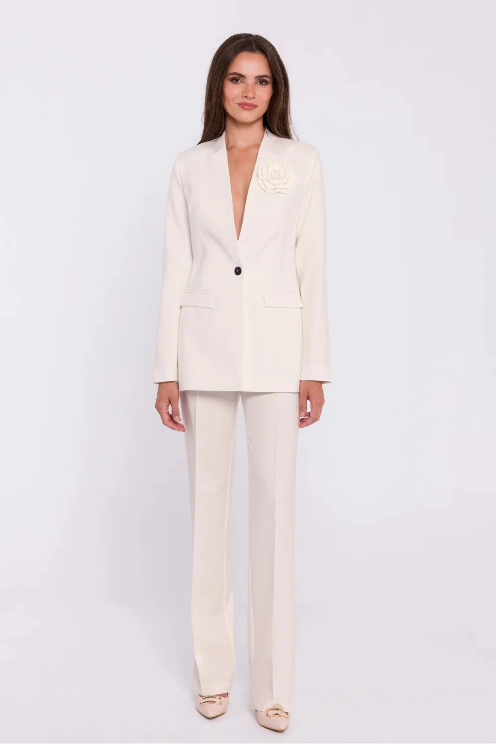 Elegantní dámské tkané sako s úzkým střihem, který zvýrazňuje siluetu. Je bez límce a zapíná se na jediný knoflík, který mu dodává moderní a minimalistický nádech. Na hrudi je připevněna ozdobná květina, která saku dodává jedinečný a ženský nádech. Kapsy s klopou přinášejí praktičnost a styl. Bunda je celá podšitá pro pohodlné nošení a vynikající povrchovou úpravu. Je navržena a ušita v Polsku a je ideální volbou pro ženy, které ocení eleganci s nádechem originality.