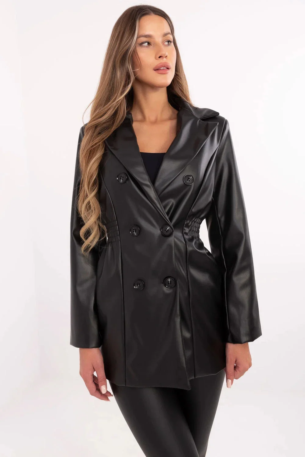 Elegantní dámský blejzr z ekokože je jedinečným prvkem šatníku, který kombinuje klasiku s moderním charakterem. Vyrobený z odolné směsi polyesteru a polyuretanu vypadá nesmírně elegantně a zároveň je praktický a snadno se udržuje. Díky podšívce poskytuje pohodlí v chladnějších dnech a činí z ní ideální volbu na podzim, zimu a jaro. Blejzr standardní délky se vyznačuje širokými límci, které mu dodávají nadčasový šarm, a vestavěnými polštářky na ramenou, které zdůrazňují siluetu a dodávají jí strukturu. Dvojitý řadový závěr na knoflíky posiluje elegantní charakter tohoto modelu, a ozdobné záhyby v pase opticky zeštíhlují postavu, dodávajíce blejzru ženský výraz. Je to skvělá volba na různé příležitosti, od každodenních stylizací po společenská setkání nebo pracovní dny. Blejzr skvěle ladí jak s elegantními kalhotami, tak s džínami, umožňující vytváření různorodých, stylových outfitů.