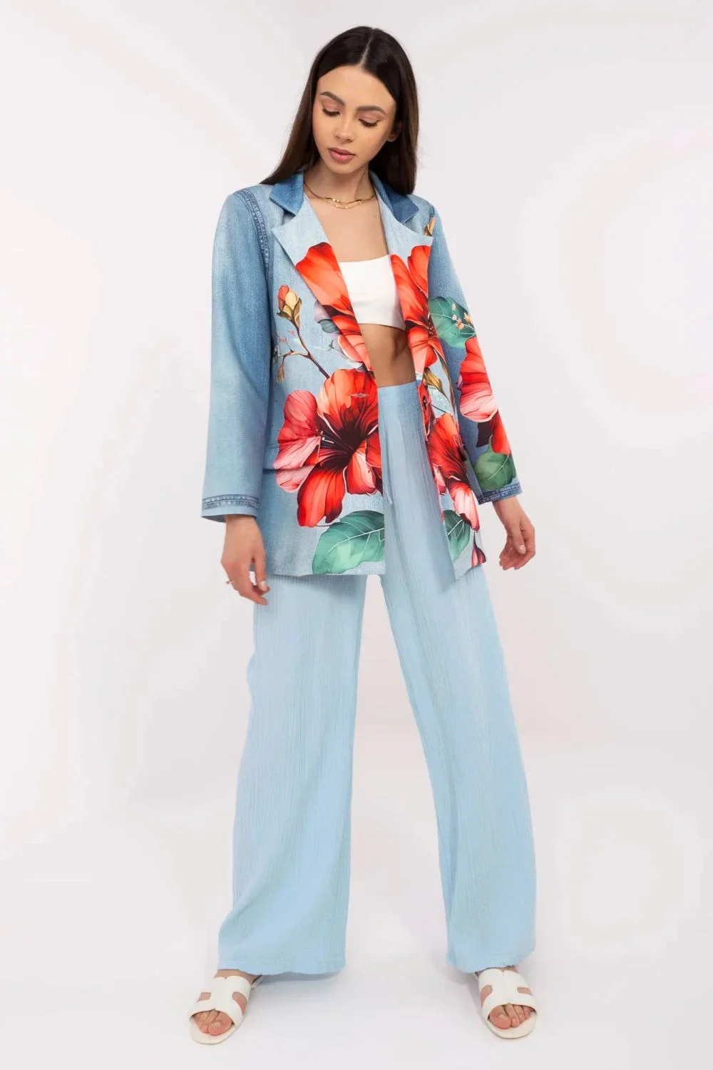 Košile s květinovým potiskem z imitace džínů je ideálním spojením stylu a pohodlí. Vyrobená z lehké směsi viskózy a polyesteru, skvěle se hodí na jaro/léto. Standardní délka a dlouhý rukáv jí dodávají univerzální charakter, a jednořadé zapínání na knoflík zdůrazňuje klasický střih. Jemný květinový potisk dodává ženský šarm a dělá z ní skvělou volbu na každý den. Košile má vestavěné ramenní polštářky, které jemně tvarují postavu, a podšívku pro větší pohodlí při nošení. Ideální pro volné stylizace, skvěle se hodí jak k kalhotám, tak k sukním.