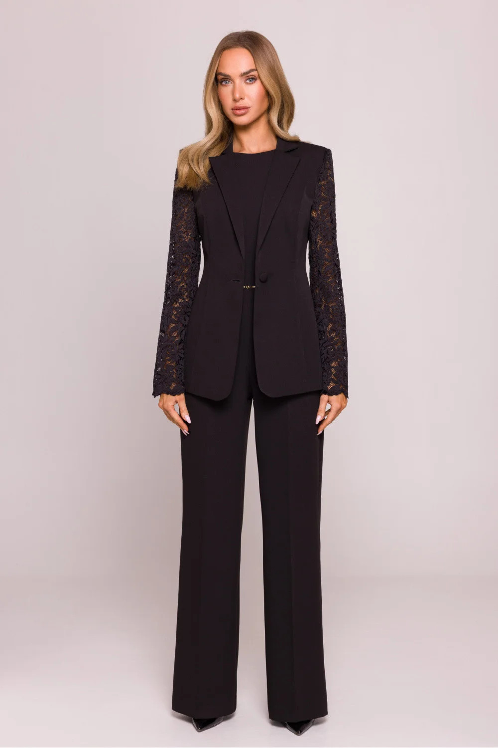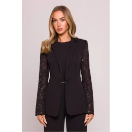 Elegantní sako, které spojuje nadčasový tvar s moderním detail. Vyrobena z hladké, vysoce kvalitní látky, byla obohacena o dlouhé rukávy z elastické krajky, které dodávají celku lehkost a ženský charakter. Klasický límeček s klopy a zapínání na jeden knoflík vpředu jí dodávají elegantní, vyvážený vzhled. Chybějící kapsy zdůrazňují čistotu formy a lehce talírovaný střih s rovným spodkem se krásně skládá na postavě, zdůrazňující její přednosti. Délka po boky z ní dělá skvělý doplněk jak do formálních stylizací, tak do modernějších kombinací např. s džíny nebo sukní. Navrženo a ušito v Polsku s důrazem na detaily a kvalitu zpracování. Krajka 90% nylon, 10% spandex.